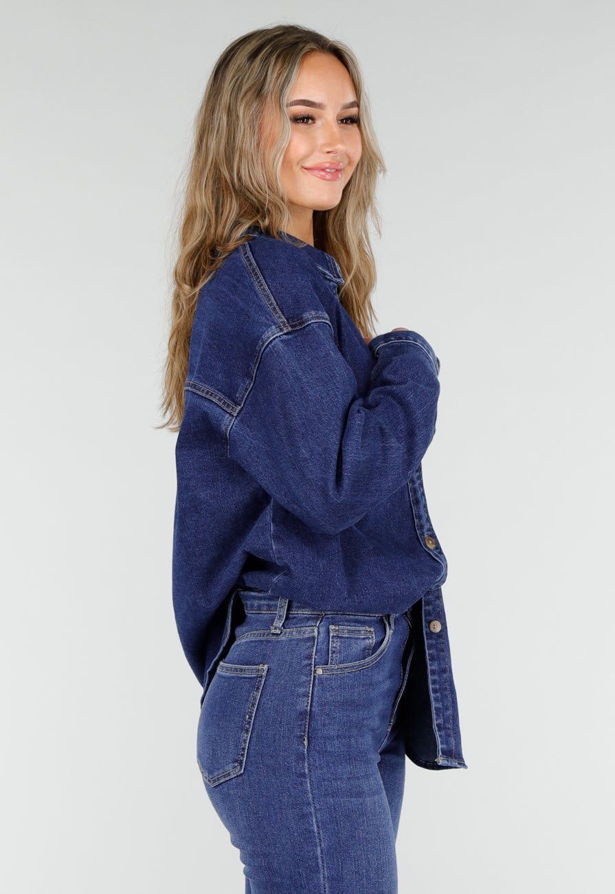 Deze denim blouse is uitgevoerd in een donkerblauwe spijkerstof met een soepele structuur. Het model heeft een klassieke kraag en een doorlopende rij knopen aan de voorkant. De blouse heeft lange mouwen met manchetten die sluiten met een knoop. De pasvorm is recht en valt losjes over het lichaam.