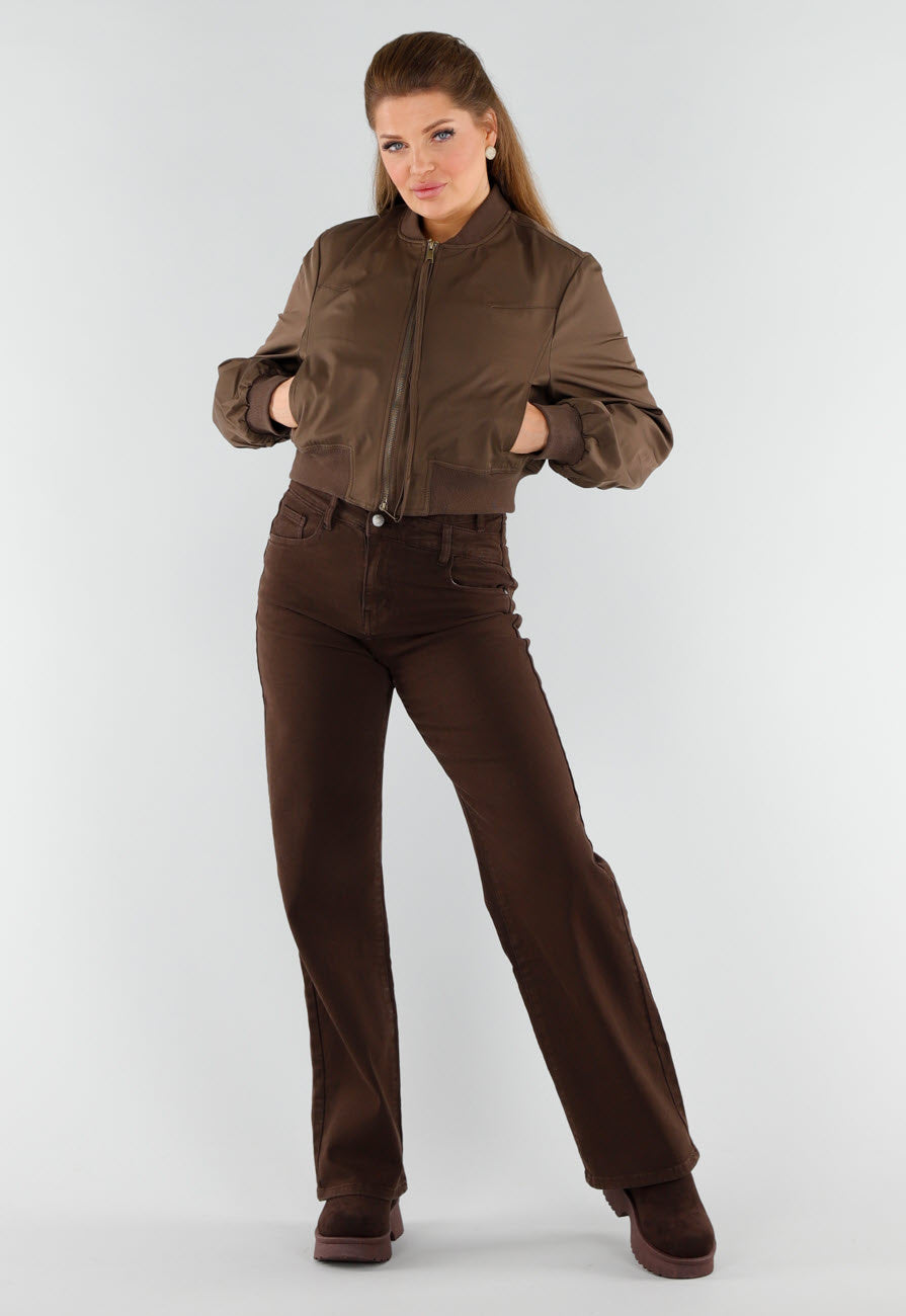 Dit bruine bomberjack heeft een moderne en sportieve uitstraling met een kort, getailleerd model. De jas is gemaakt van een gladde, licht glanzende stof en voorzien van een stevige metalen ritssluiting aan de voorkant. De elastische boorden aan de mouwen en taille zorgen voor een comfortabele pasvorm en een perfecte vormbehoud. Dankzij de subtiele schouderdetails en de soepele afwerking combineert deze bomber moeiteloos stijl en comfort. Ideaal voor zowel casual als stoere looks.