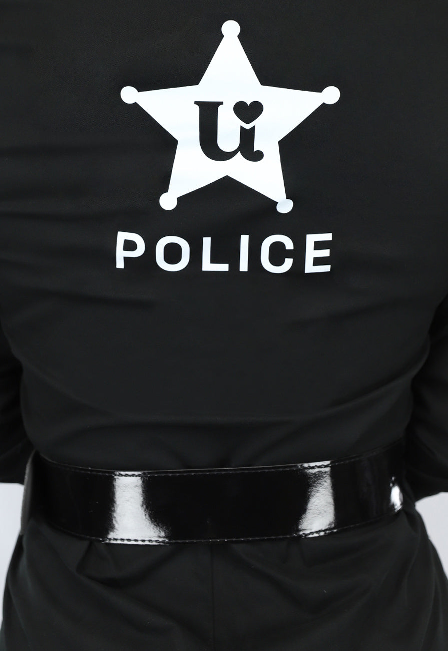 De jumpsuit heeft lange mouwen en is voorzien van een ritssluiting met een kraagje. Om het er realistischer uit te laten zien, staat het politie badge op de borst en aan de achterzijde staat het Uwantisell police logo.