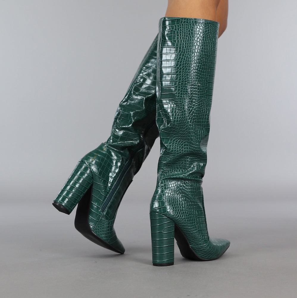 Donkergroene Croco Laars met Spitse Neus