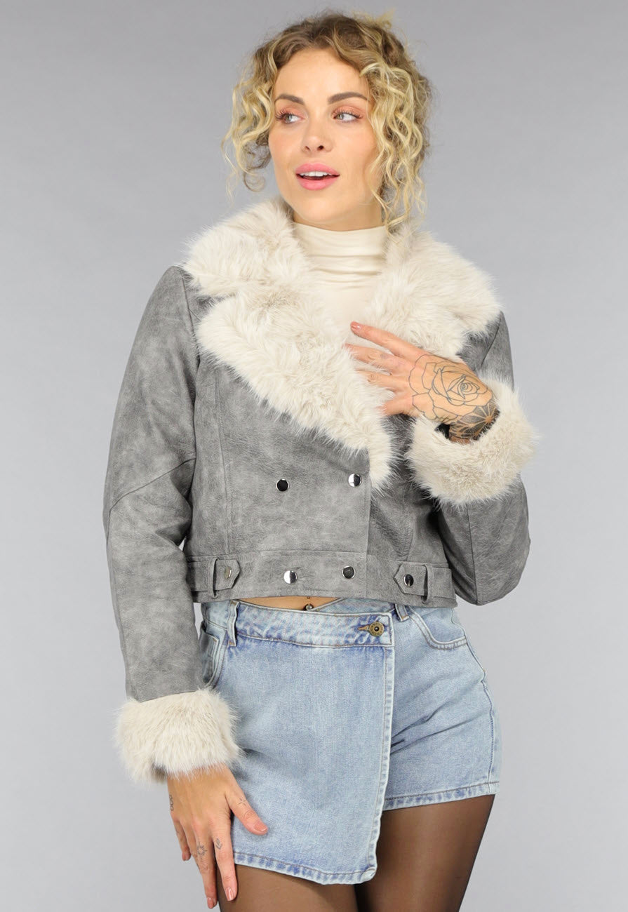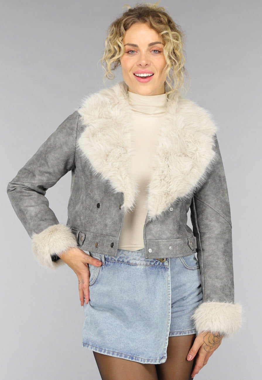 Grijze Korte Jas met Beige Bontkraag Lees meer