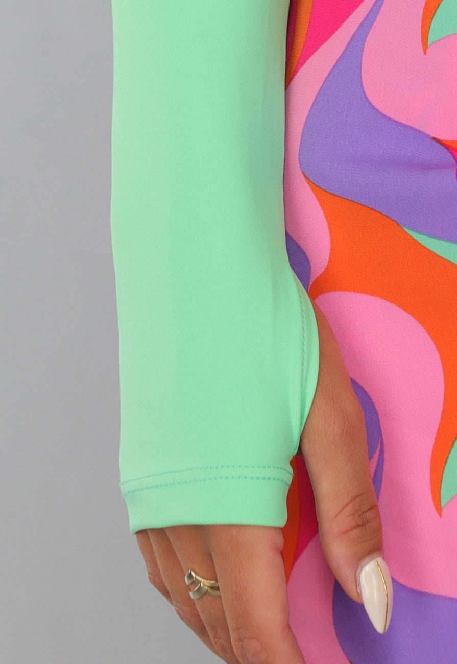 Deze bolero crop top heeft een mintgroene kleur en valt boven de borst. Hij heeft een ronde hals met lange mouwen. Aan de uiteindes van de mouwen is hij voorzien van duimgaten. Deze top is perfect voor festivals of zomerdagen! De top waar de bolero mee gecombineerd is dient besteld te worden, deze zit er niet bij.