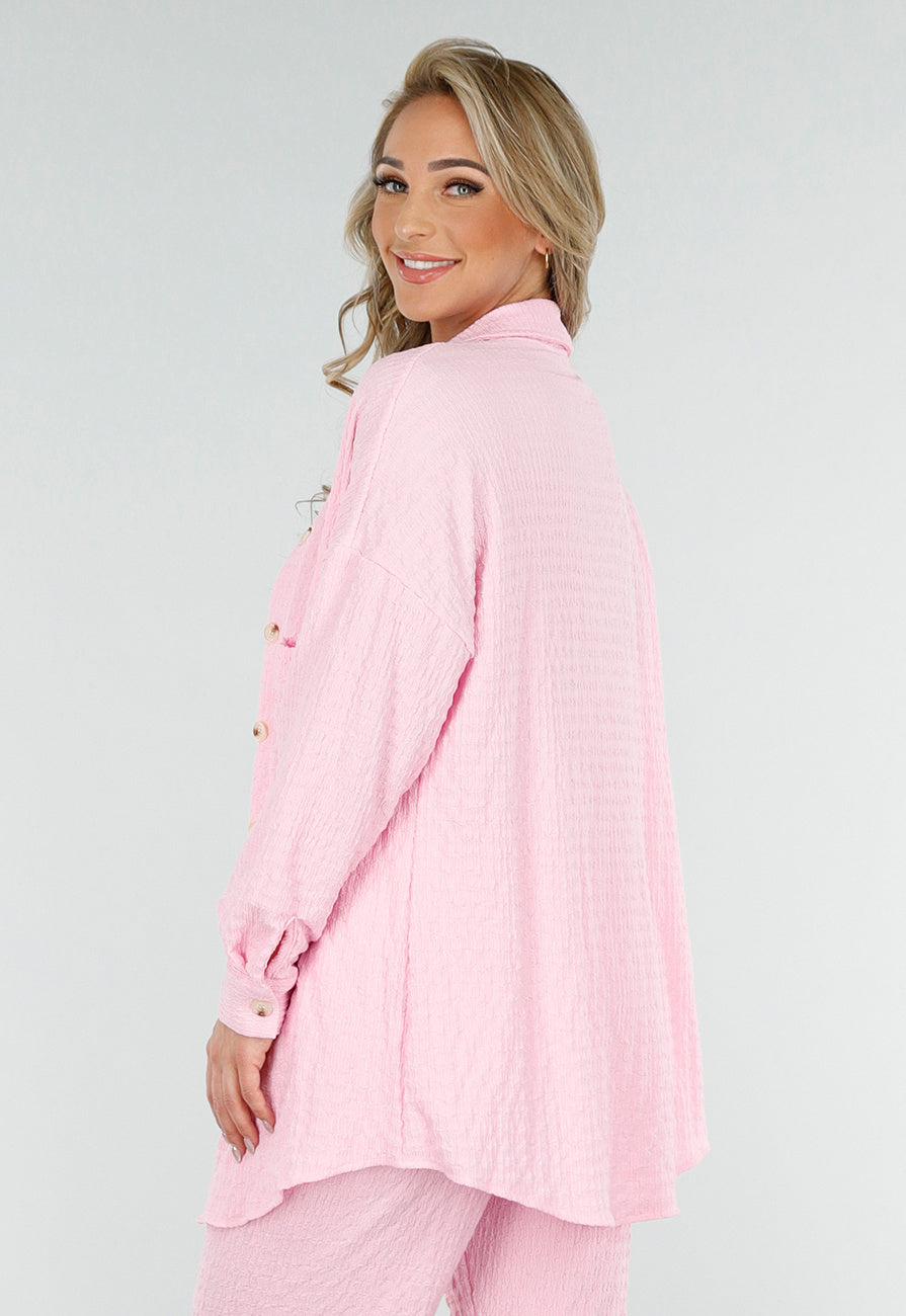 Deze stretchy lichtroze set bestaat uit een luchtige afgeronde doorknoop blouse met hoornknopen en een rechte broek met een elastische tailleband. De blouse is voorzien van lange mouwen, oversized zakken en manchetten. De crinkle stof geeft de set een nonchalant effect en zorgt voor een comfortabele pasvorm. De rechte broek valt soepel en is perfect voor warme dagen. Draag het als complete look of combineer de losse stukken met andere basics voor een afwisselende outfit.