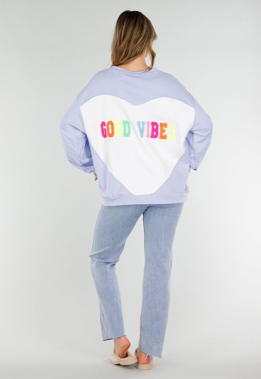 Deze sweater is uitgevoerd in een lichtblauwe stof met een ronde hals en lange mouwen. Het model heeft een rechte, losvallende pasvorm met ribboorden aan de mouwen en onderzijde. Op de achterzijde bevindt zich een contrasterend paneel met de tekst "GOOD VIBES" in meerkleurige letters.