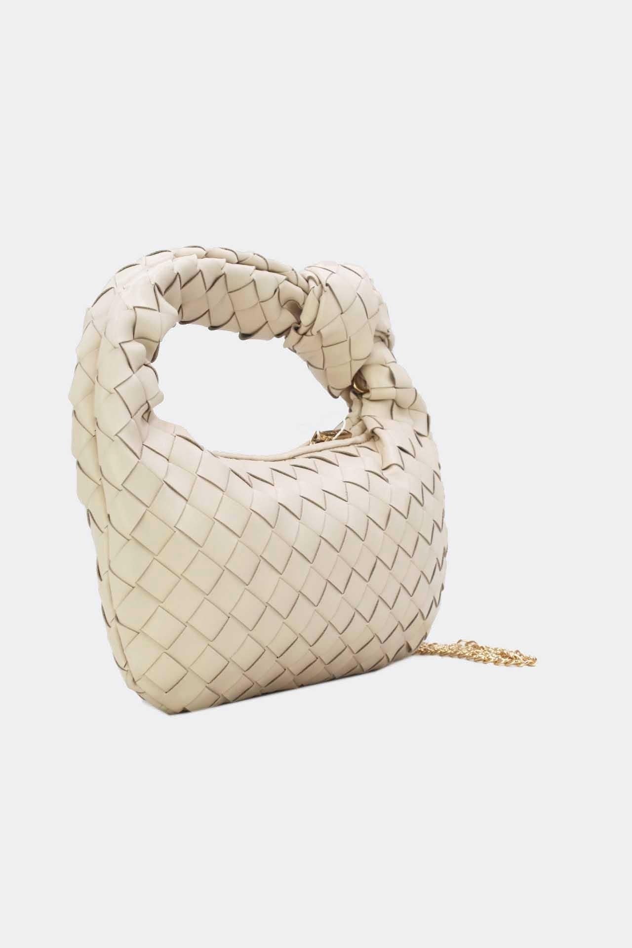Deze off white schoudertas is uitgevoerd in gevlochten imitatieleer en heeft een compacte, afgeronde vorm. Het korte hengsel is voorzien van een opvallend knoopdetail, terwijl de bovenzijde sluit met een goudkleurige ritssluiting. Naast het korte handvat beschikt dit model over een extra afneembaar lang goud chainhengsel, zodat de tas ook als crossbody gedragen kan worden. Het gevlochten patroon geeft de tas een gestructureerde uitstraling, terwijl de soepele afwerking zorgt voor een moderne look.