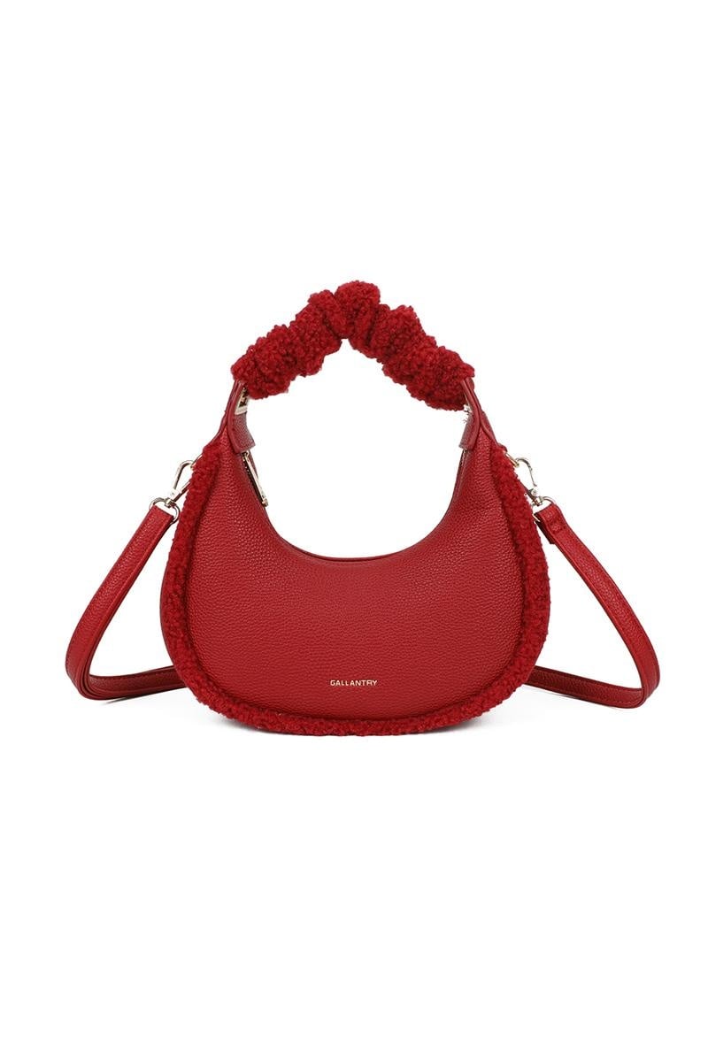 Rode handtas in halve maan vorm met teddy look details langs de randen en op het handvat. Uitgevoerd met een gerimpeld handvat en een afneembare schouderriem, zodat je de tas in de hand of crossbody kunt dragen. Het hoofdvak sluit met een rits en is gevoerd met een binnenvak. Gemaakt van kunstleer en zachte teddy afwerking.