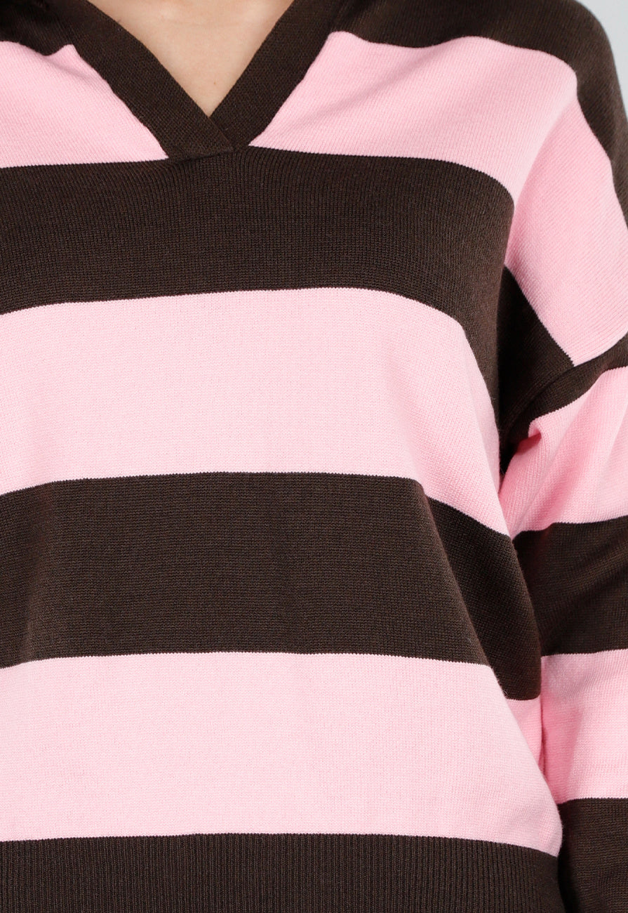 Deze polo trui is uitgevoerd in een combinatie van roze en bruin met brede horizontale strepen. Het model is gemaakt van een fijngebreide stof met lichte stretch en heeft een rechte pasvorm. De trui is voorzien van lange mouwen met geribde boorden en een brede geribde zoom aan de onderzijde. De hals is afgewerkt met een polokraag en een V-hals zonder knoopsluiting.