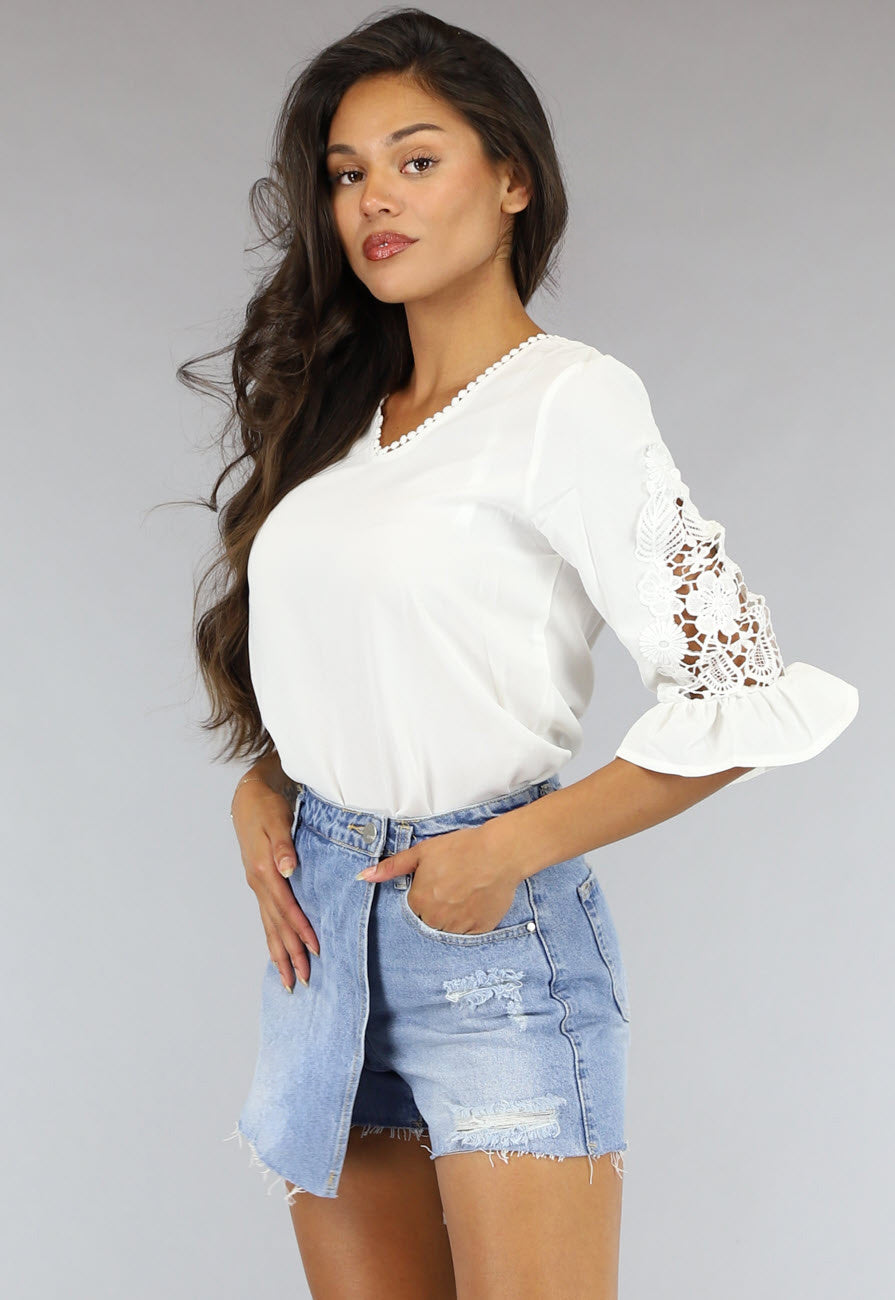 Deze losse blouse is wit van kleur en heeft een V hals met leuke bolletjesdetails. De blouse is gemaakt van een luchtige stof en heeft halflange mouwtjes met leuke gehaakte details.
