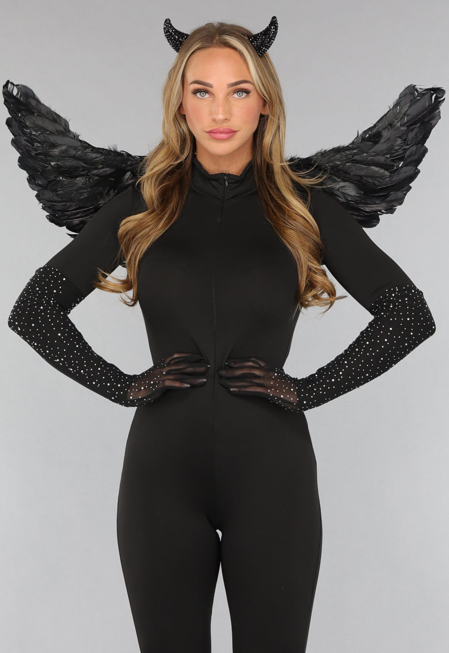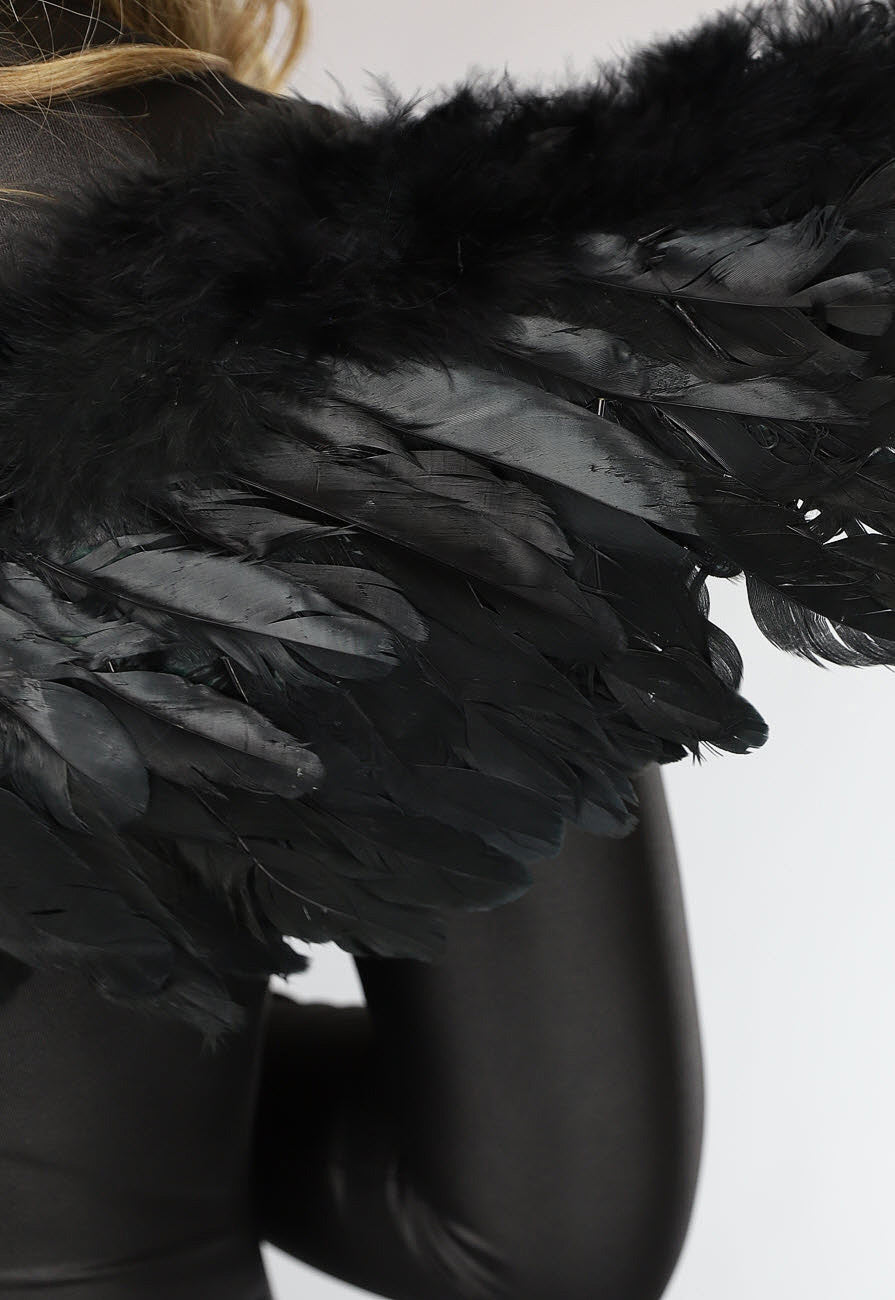 Mis jij nog net dat ene detail van je Halloween outfit? Kijk dan eens naar deze prachtige engelen vleugels. De vleugels zijn zwart en gemaakt van veren. Aan de achterzijde zitten twee elastieken banden waardoor je de vleugels met gemak kan dragen.