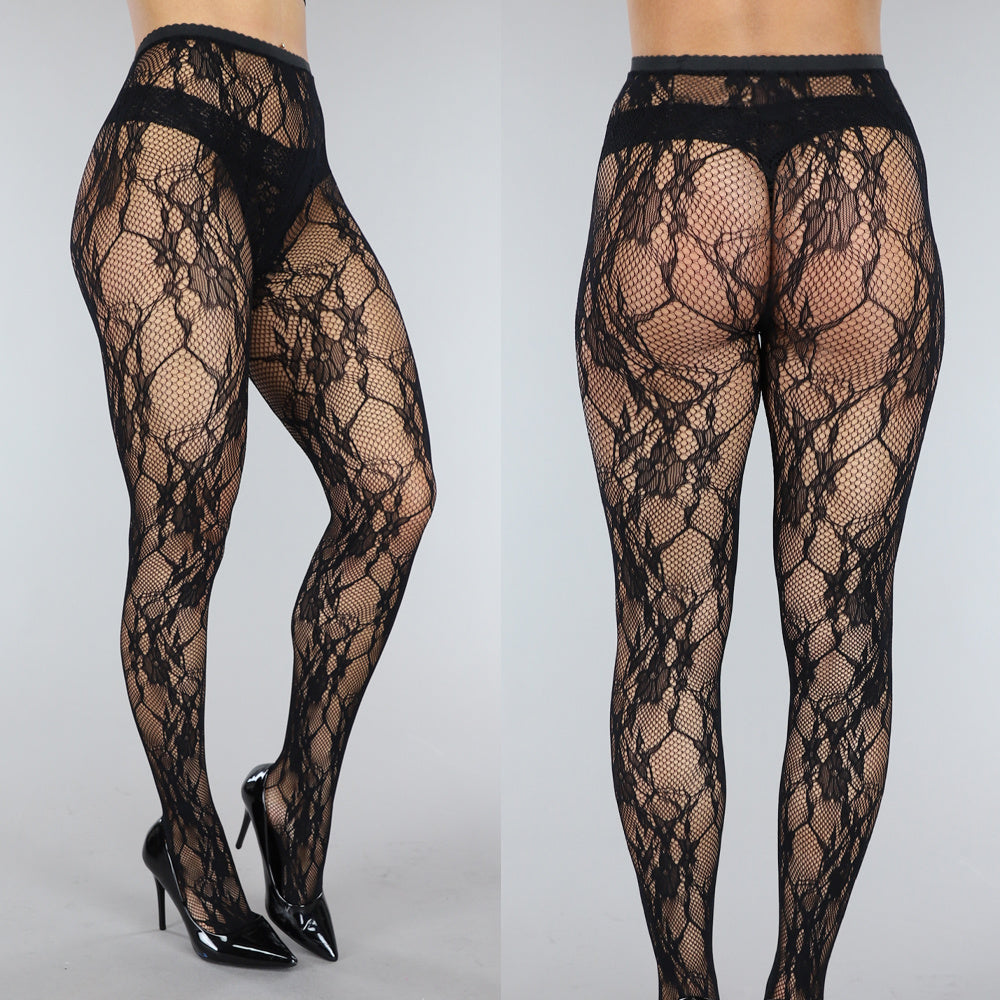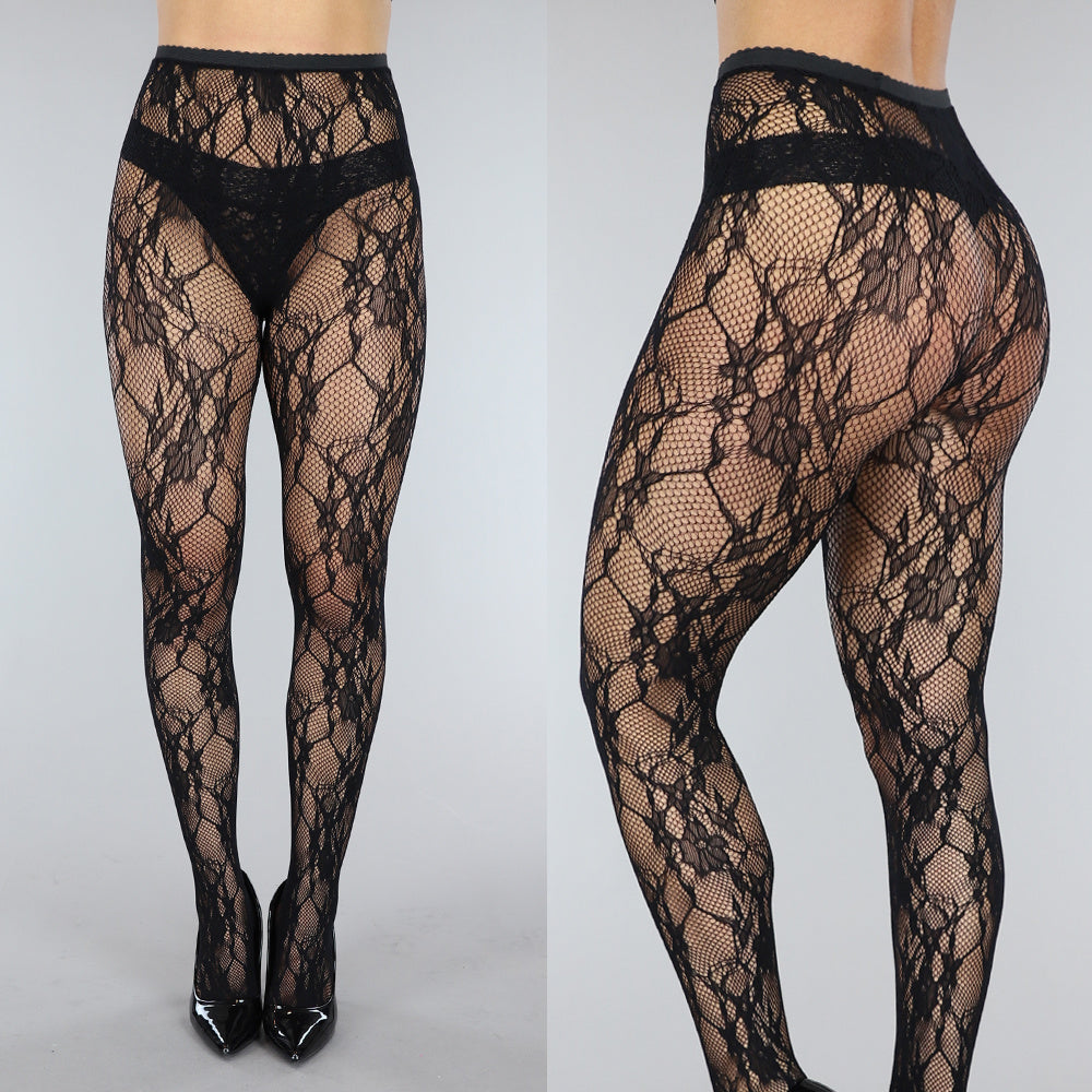 Deze panty is uitgevoerd in zwart kant met een open netstructuur en een doorlopend bloemmotief. Het model heeft een hoge taille met een elastische tailleband. Het materiaal is rekbaar en sluit aansluitend aan op de benen.