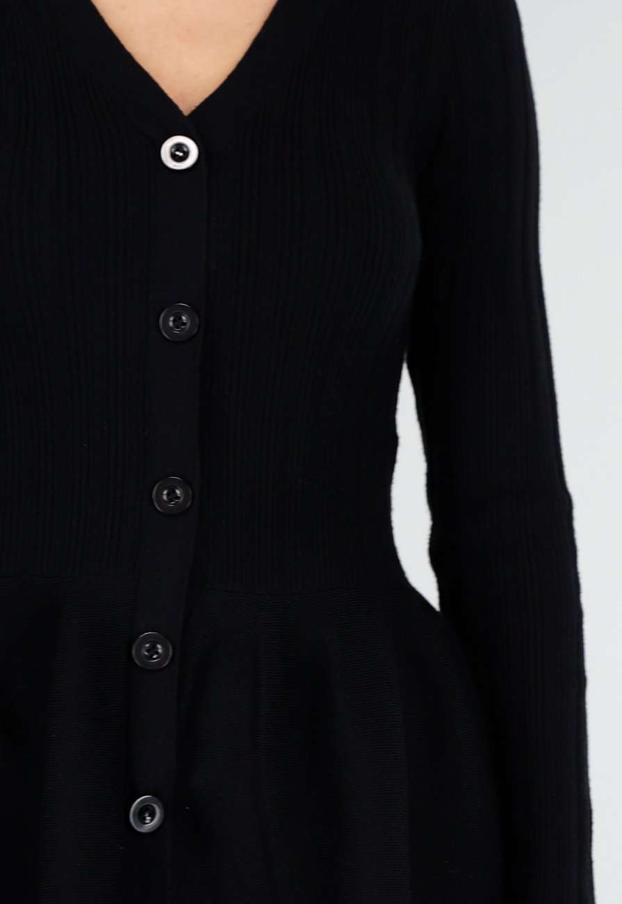 Deze zwarte 2-piece set bestaat uit een top en broek van ribgebreide stretch stof. De top heeft een V-halslijn, lange mouwen en knoopsluitingen aan de voorzijde. De taille is aangesloten en loopt vanaf daar wijd uit in een peplumvorm. De broek heeft een hoge taille met elastische band.