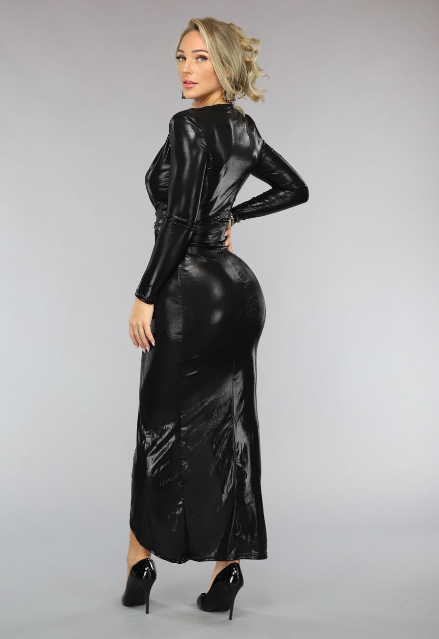 Deze geweldige party dress heeft een zwarte kleur en is gemaakt van een glanzende, metallic stof met veel stretch. De jurk heeft lange mouwen en een split aan de zijkant. Bovendien zijn de schouders voorzien van subtiele schoudervulling, waardoor je een prachtig zandloperfiguur krijgt. De halslijn van de jurk is gedrapeerd. Het ontwerp van de jurk is perfect voor speciale gelegenheden!