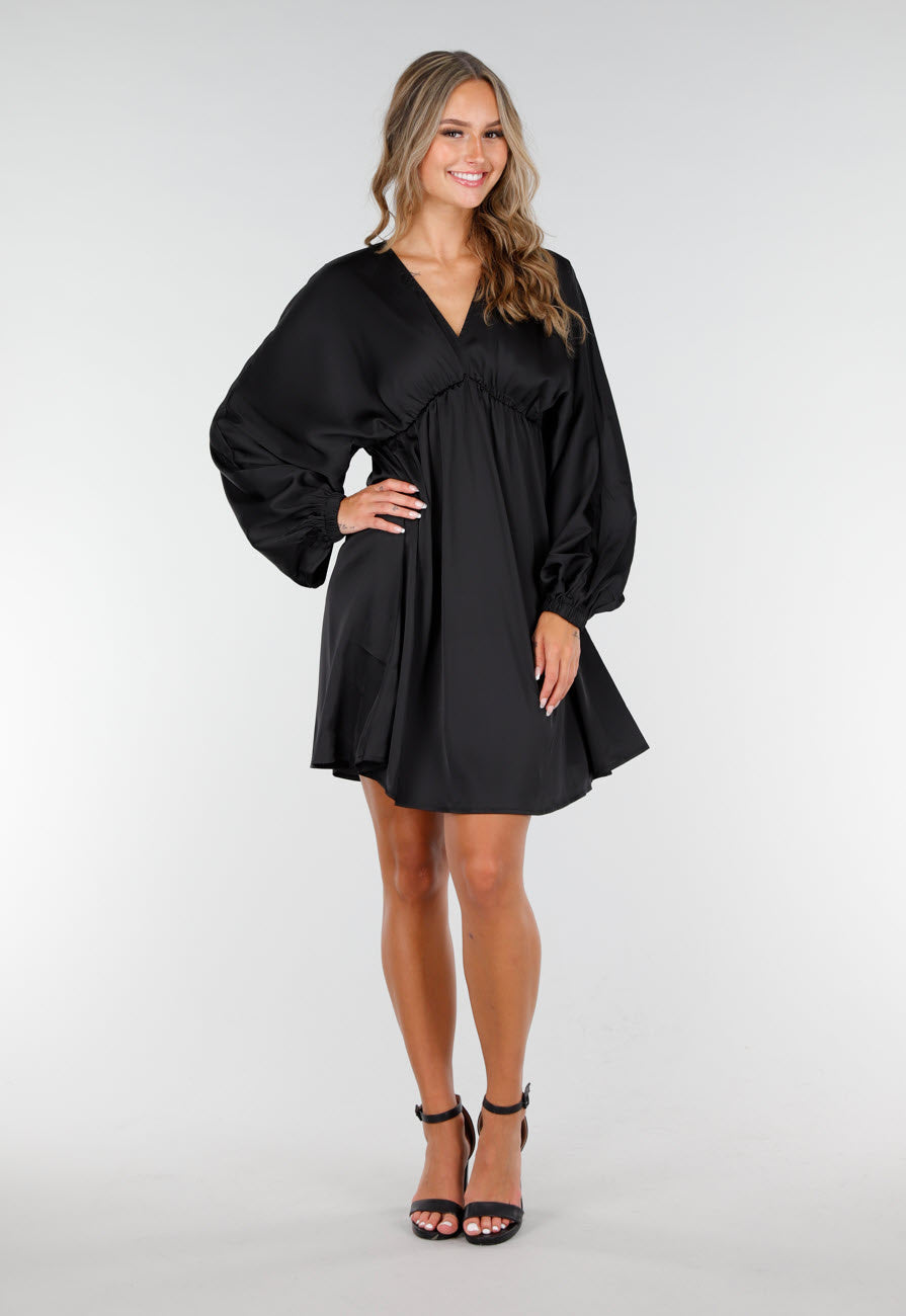 Zwarte Satijnen Longsleeve Jurk