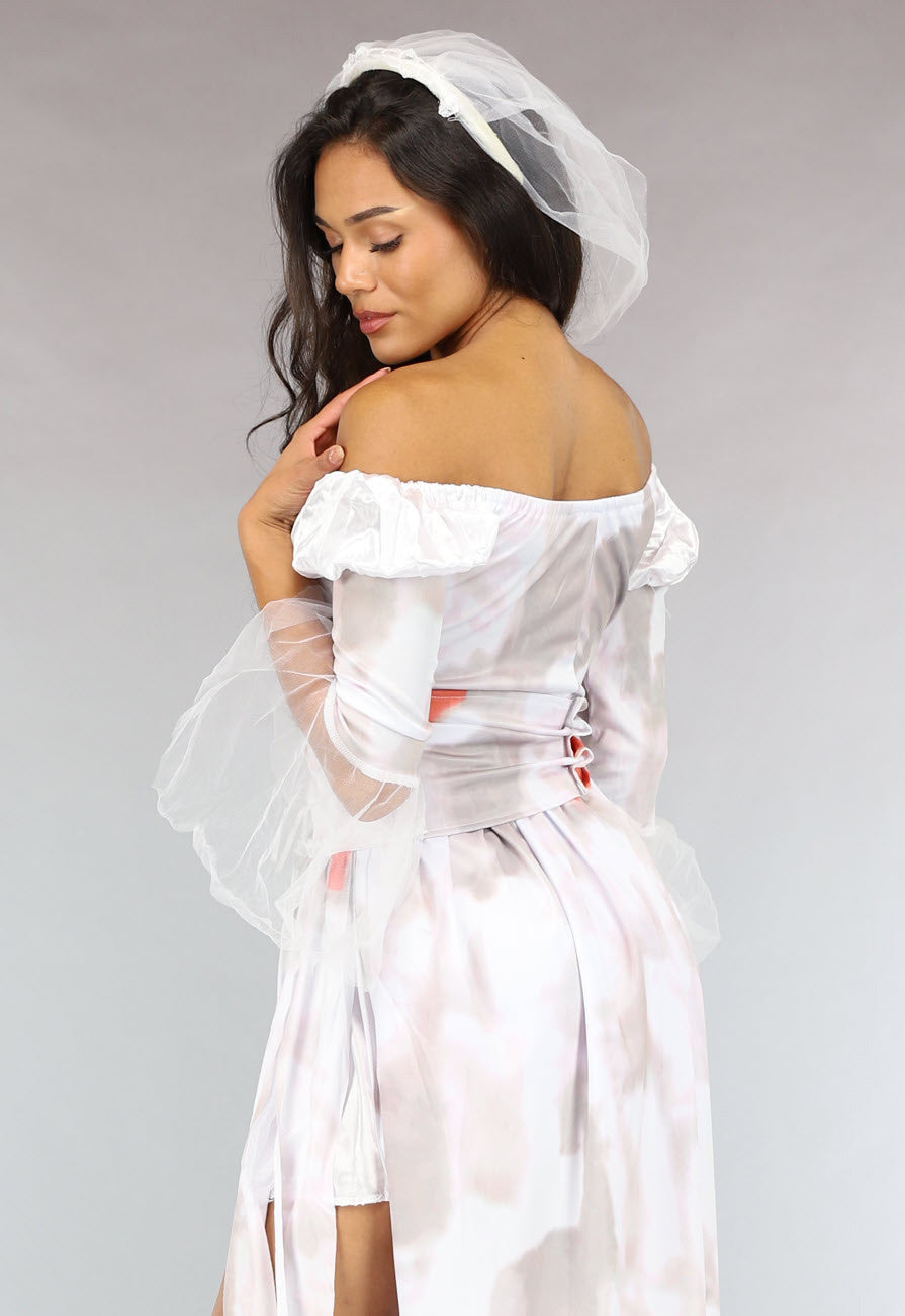De jurk is voorzien van vieze bebloede vlekken. De jurk heeft kleine pofmouwtjes met daaraan vast een mouw welke uitlopend is. Het bovenlijfje van de jurk is geplooid en kan je aanvullen met de bijgeleverde tailleband. Deze tailleband geeft een korsetlook aan de jurk. De jurk is elastisch en daardoor gemakkelijk aan en uit te trekken. Er wordt een diadeem met sluier meegeleverd om het kostuum helemaal af te maken.
