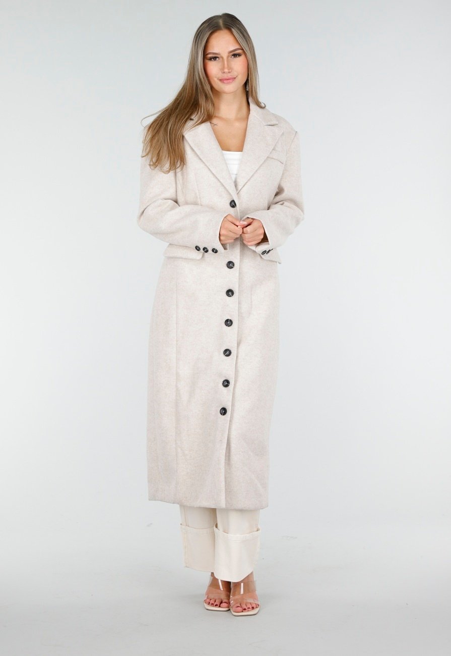Deze lange manteljas is uitgevoerd in een licht gemêleerde beige kleur. De jas heeft een recht en iets getailleerd silhouet en valt lang. De voorzijde sluit met een rij zwarte knopen en bevat twee klepzakken ter hoogte van de heupen en een borstzak. De mantel is voorzien van een klassieke reverskraag en heeft decoratieve knoopdetails aan de mouwuiteinden. Het materiaal heeft een licht wollige uitstraling en stevige structuur.