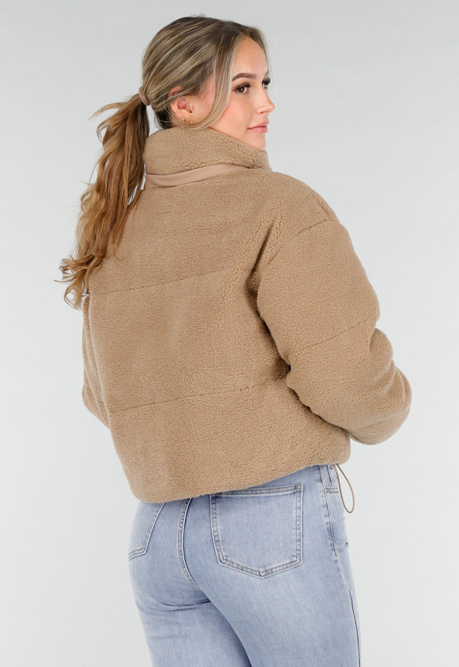 Deze beige teddy puffer jas is gemaakt van zacht fleece met een gewatteerde structuur. De jas heeft een hoge kraag en een afneembare capuchon die met een rits kan worden bevestigd of losgehaald. Het korte model valt tot op de taille en heeft lange mouwen. De jas sluit aan de voorkant met een rits en extra drukknopen. Doorgestikte banen zorgen voor een volumineuze en gelijkmatige afwerking. Onderaan de jas zit een verstelbaar trekkoord waarmee de onderkant strakker kan worden aangetrokken.