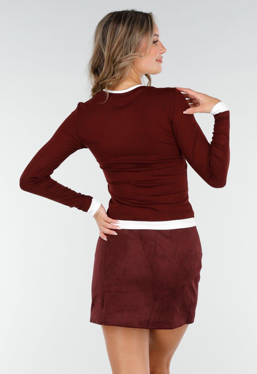 Deze bordeauxrode longsleeve top is gemaakt van een zachte, gladde stretchstof met een rechte pasvorm. De ronde halslijn, mouwuiteinden en onderzijde zijn afgewerkt met witte boorden, die voor een subtiel contrast zorgen. Dankzij de elastische kwaliteit biedt deze top veel draagcomfort.