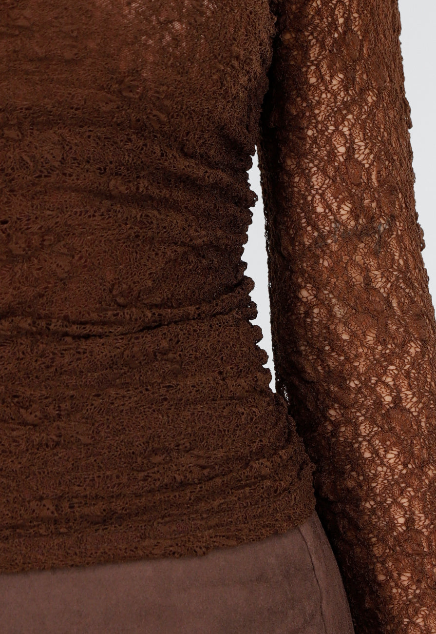 Deze bruine top is gemaakt van fijn stretchkant met een transparant bloemenpatroon. De top heeft een subtiele opstaande halslijn en lange, see through mouwen. Het voorpand is gevoerd en heeft een gedrappeerd effect dat zichtbaar over de buik valt. de mouwen zijn volledig doorschijnend.