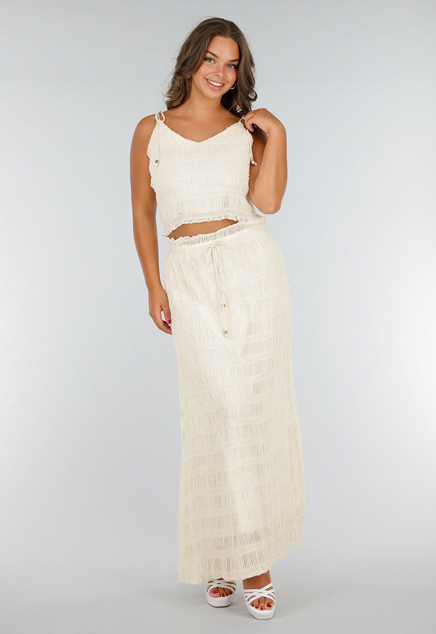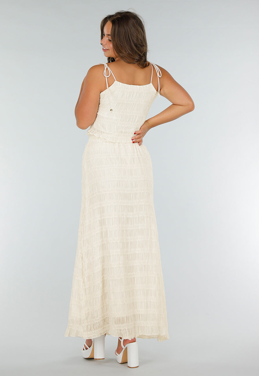 Deze crèmekleurige tweedelige set bestaat uit een mouwloze croptop en een bijpassende maxi-rok, beide voorzien van een gesmokt stretchmateriaal. De top heeft verstelbare bandjes met kraaltjes die gestrikt worden op de schouders, wat zorgt voor een verstelbare pasvorm. De maxi-rok is high waist en wordt in de taille vastgezet met een strikkoord met kraaltjes. Beide zijn gevoerd zodat ze niet doorschijnen. Dankzij de rekbare stof sluit de set comfortabel aan en beweegt hij soepel mee met het lichaam. Perfect voor jouw volgende vakantie of een dagje strand in eigen land.