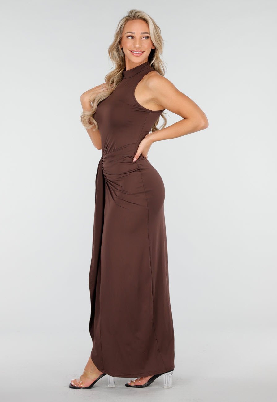 Deze lange jurk in donkerbruin is gemaakt van een soepele stretchstof die mooi aansluit op het lichaam. Het model heeft een hoge hals, een sierlijke plooidetail met ruches aan de zijkant en een opvallende hoge split die zorgt voor een elegante uitstraling. De jurk sluit met een rits op de rug.
