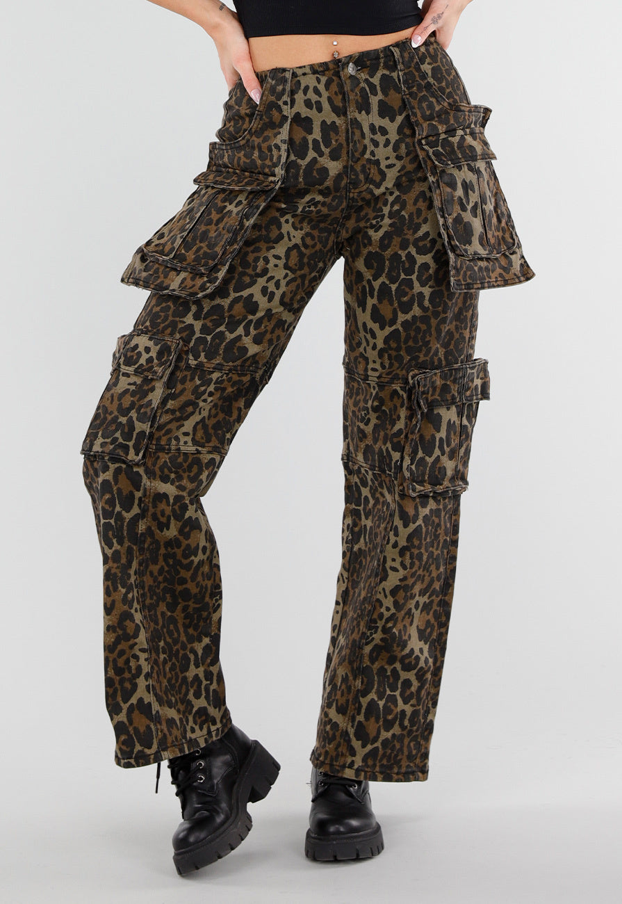 Denim cargo broek met opvallende leopard print en een stoere uitstraling. De broek heeft een mid waist pasvorm en is gemaakt van stevig denim met stretch voor extra comfort tijdens het dragen. Het model is voorzien van meerdere cargo zakken op de pijpen, waardoor de broek een trendy en utility geïnspireerde look krijgt. Riemlusjes in de taille maken het mogelijk om de broek te combineren met een riem, terwijl de elastische tailleband aan de achterkant zorgt voor een fijne en aansluitende pasvorm. De rechte pijpen en het opvallende patroon maken deze cargo broek een statement item dat perfect te combineren is.