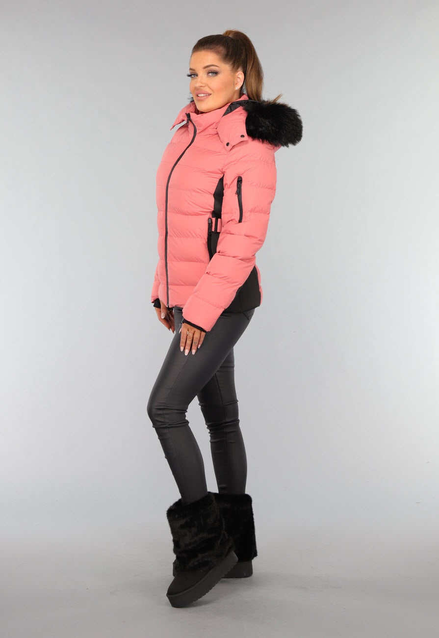 Deze jas heeft lange mouwen met aan het uiteinde aansluitende boorden welke ook beschikken over duimgaten. Deze boorden zorgen ervoor dat de wind er niet doorheen kan via de mouwen. Hij is van binnen gewatteerd waardoor die lekker warm is. Aan de voorzijde zit een ritssluiting en twee zakken met ritssluiting. Op de linkermouw zit tevens nog een extra zak met ritssluiting. Daarnaast is deze jas voorzien van een capuchon met een imitatie bontkraag en drukknoopjes. Word geleverd inclusief vaste verstelbare tailleriem.