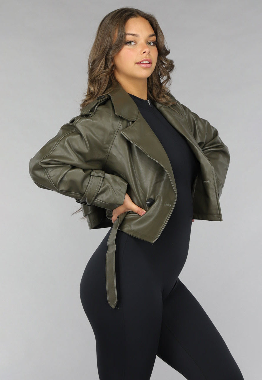 NEW120225 Korte Khaki Lederlook Jasje Maat S