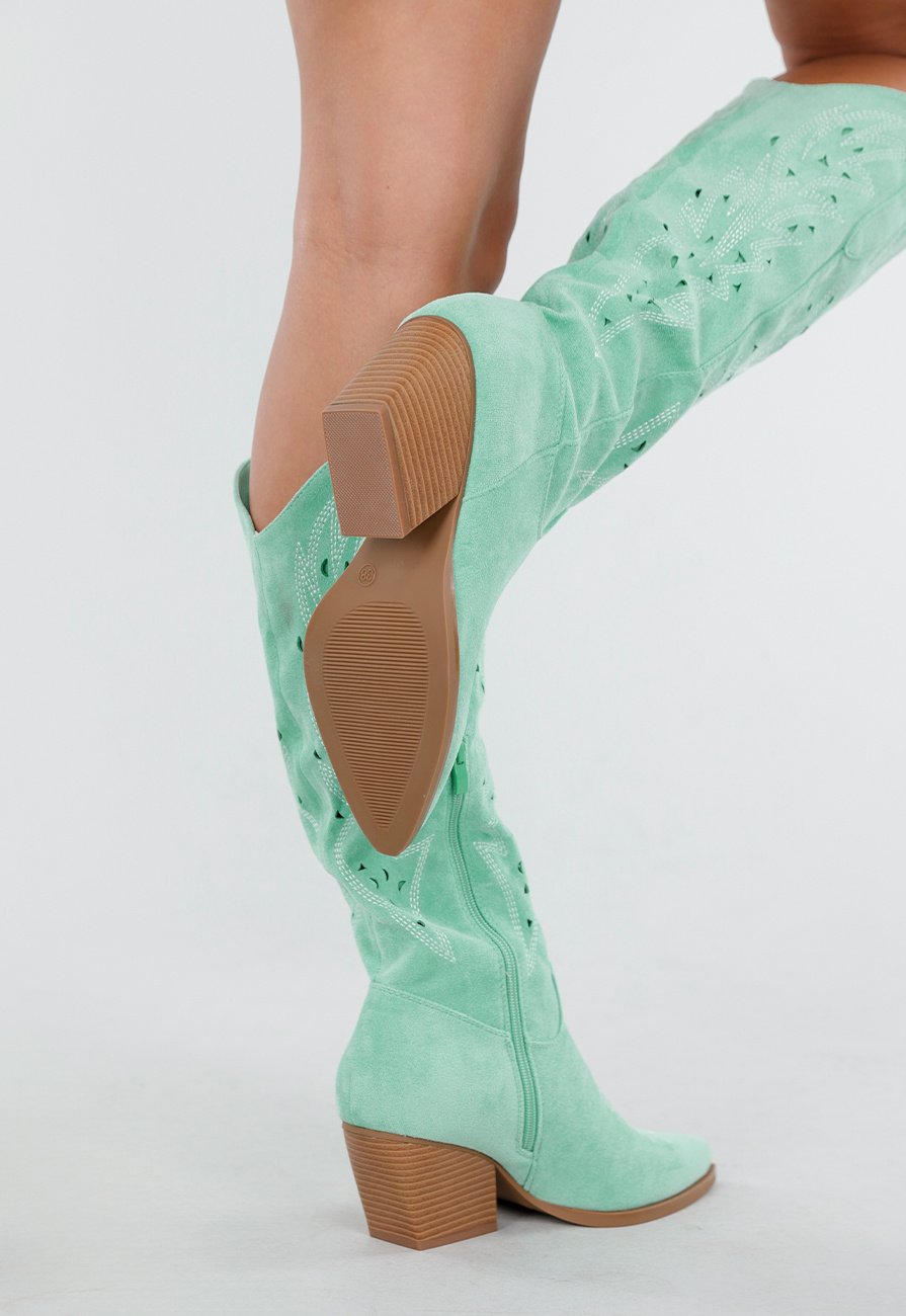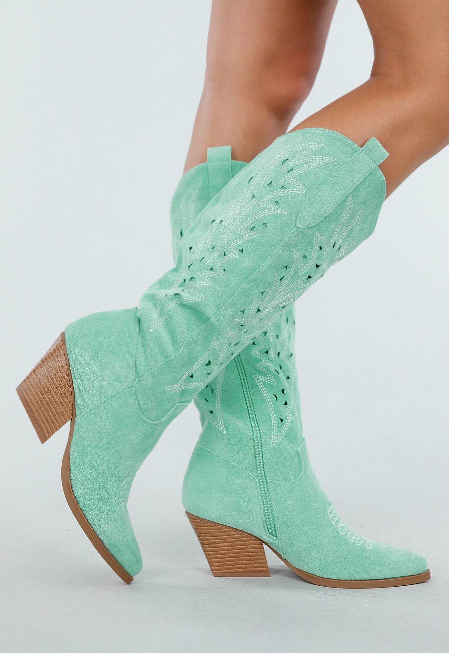 Deze mintgroene cowboylaarzen zijn gemaakt van suèdelook materiaal en hebben decoratieve uitsnedes over de hele schacht. De laars sluit aan de binnenzijde met een rits in bijpassende kleur. De schacht heeft een diepe V-inkeping en twee lussen aan de bovenzijde.