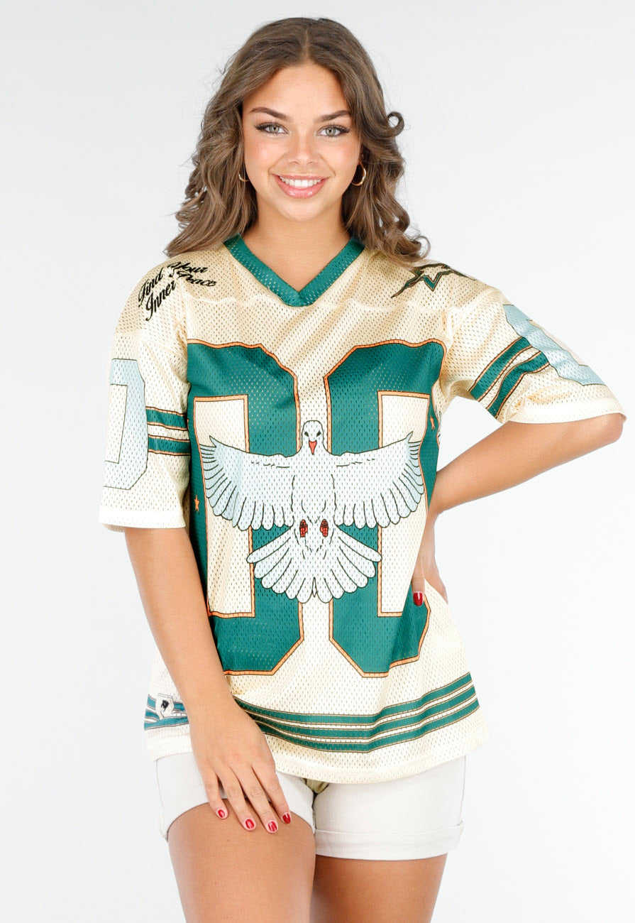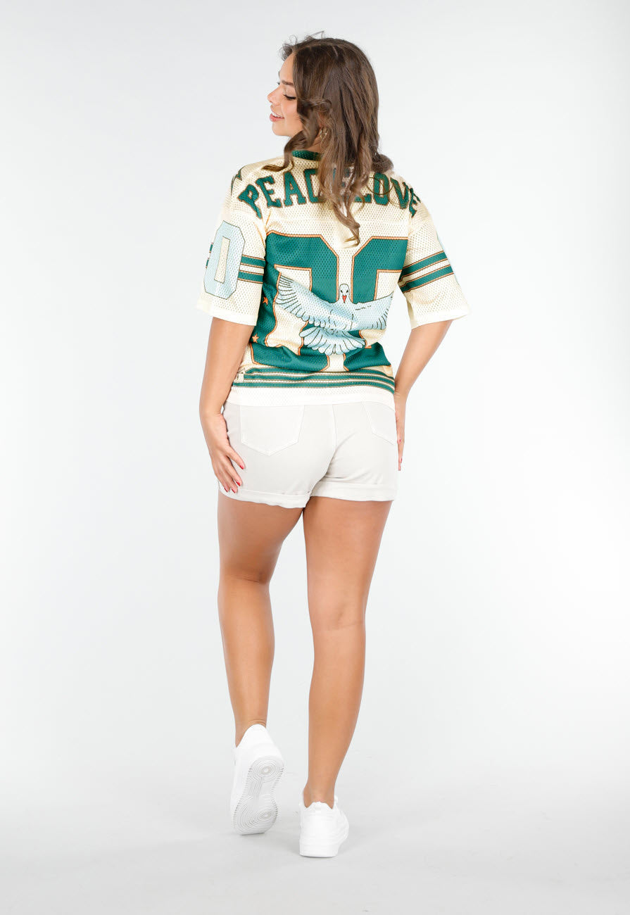 Dit trendy oversized sportieve baseball t-shirt is uitgevoerd in beige met opvallende turquoise details. De duif print op de voorkant geeft een speelse twist. Het shirt heeft korte mouwen en een v-hals. Het comfortabele materiaal maakt het ideaal voor dagelijkse outfits of een sportieve look. Het t-shirt is gemaakt van een soepele, stretchy stof met kleine gaatjes.