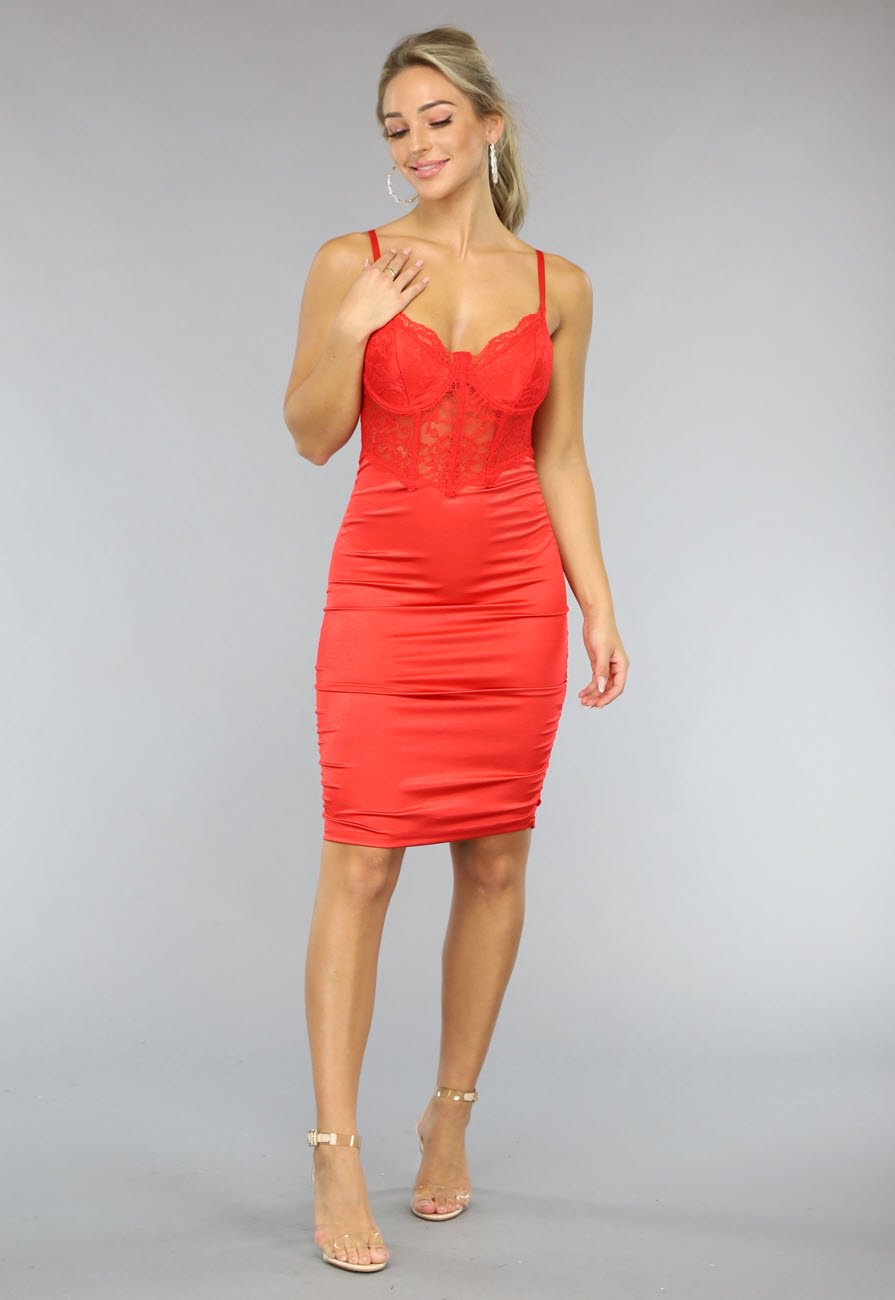 Deze mooie rode jurk is aan de onderkant gemaakt van een shiny, satijnen stof en bevat geplooide details aan de zijkant. Aan de bovenzijde heeft de jurk cups met beugels, waardoor het dragen van een bh volledig overbodig is. Bovendien is de jurk aan de bovenzijde voorzien van prachtige kanten details en heeft hij plastic baleinen in het midden waardoor deze een korset look krijgt. Aan de achterzijde heeft de jurk verstelbare spaghettibandjes en een doorschijnende mesh stof met veel stretch.