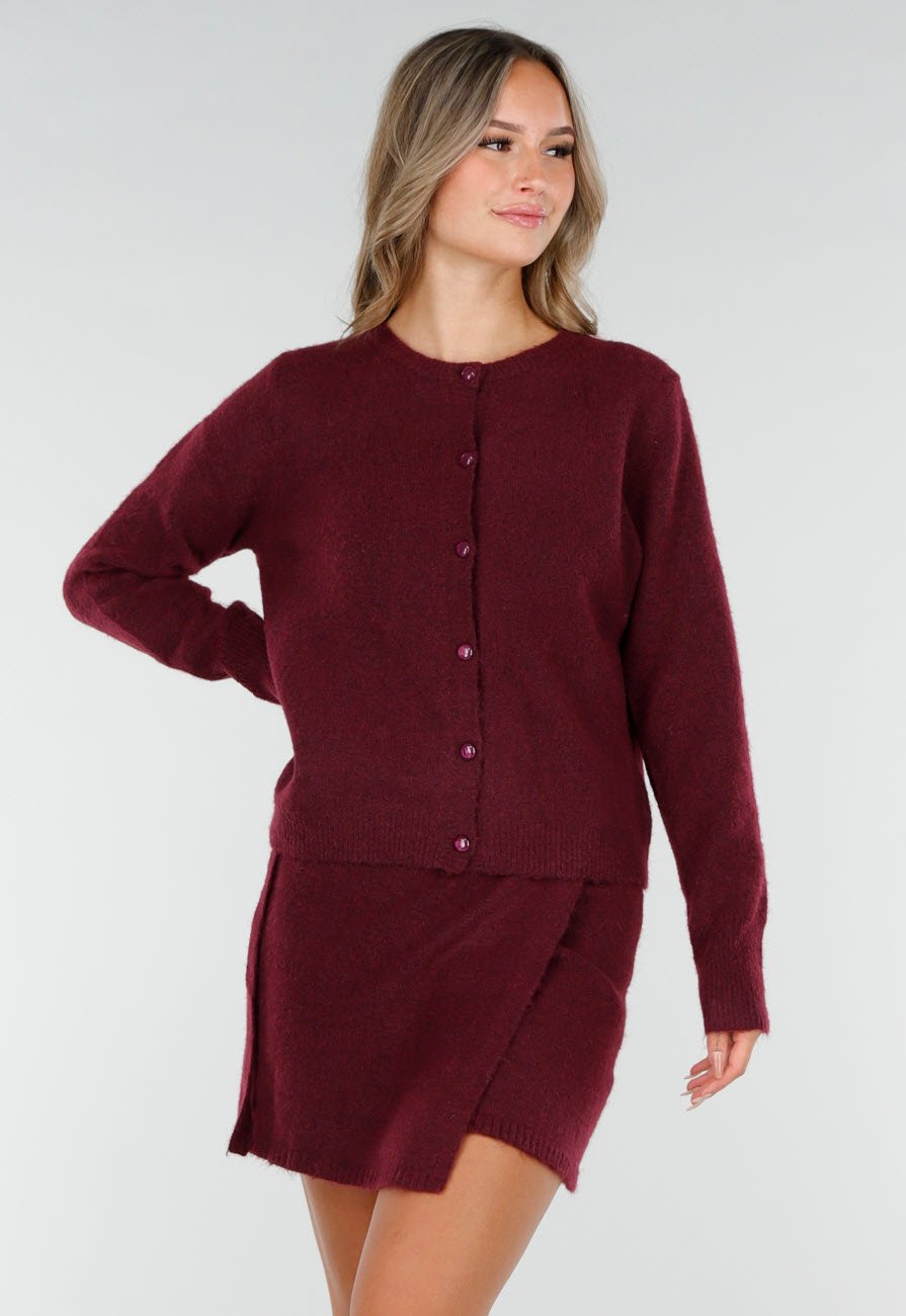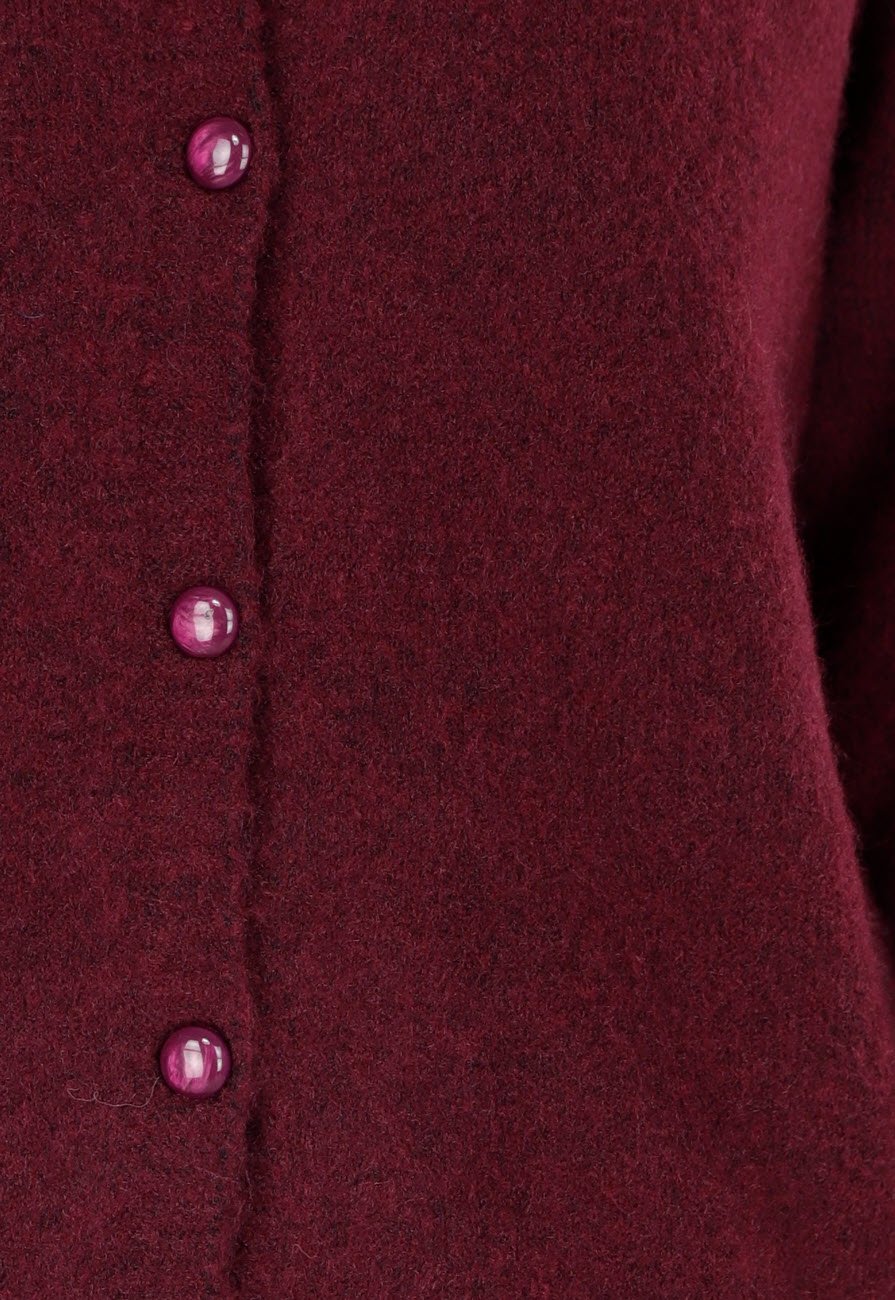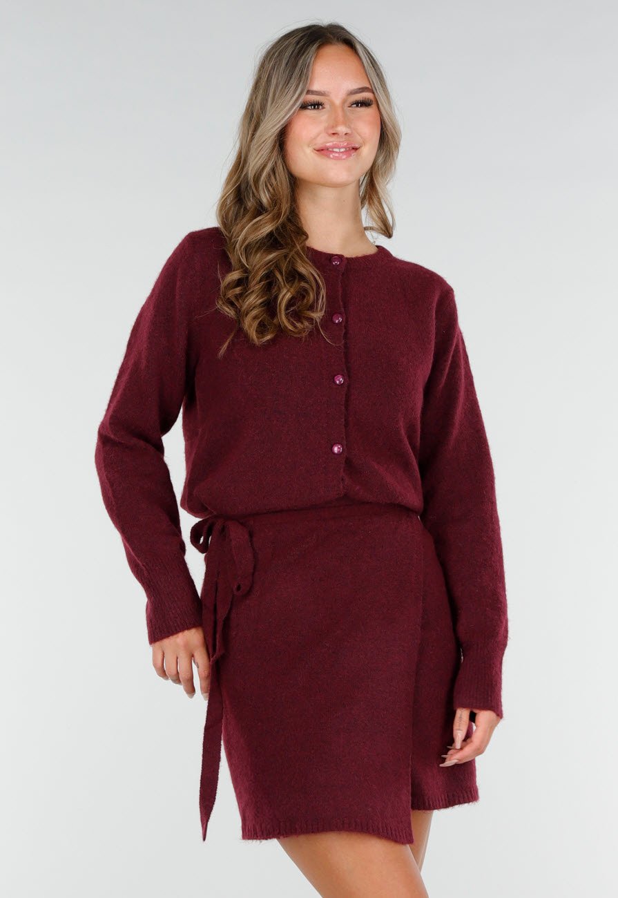 Dit bordeauxrode vest is gemaakt van een zachte gebreide stof en heeft een klassieke knoopsluiting aan de voorzijde. Het model is voorzien van een ronde hals en lange mouwen. De rechte pasvorm en zoom geven het vest een tijdloos karakter, waardoor het eenvoudig te combineren is met zowel een rok als een broek. Dit vest kan los gedragen worden of gesloten.