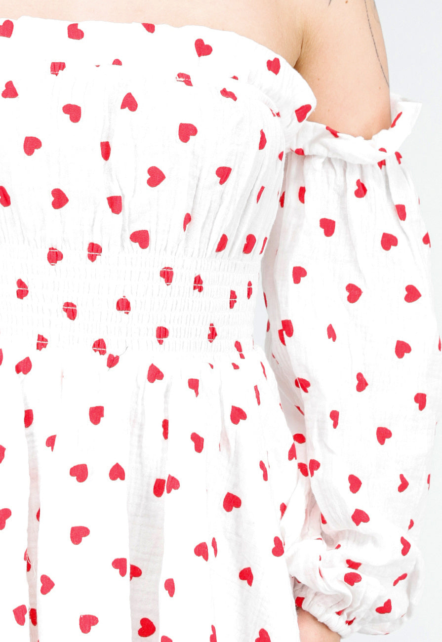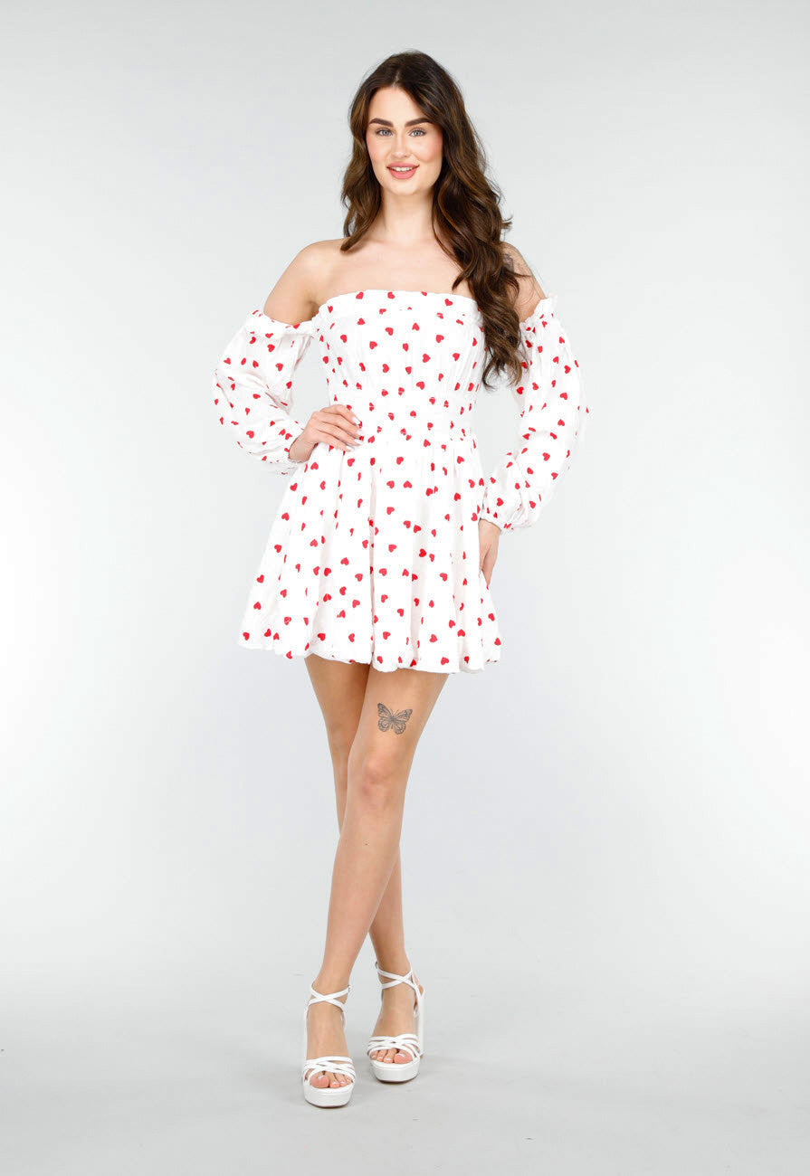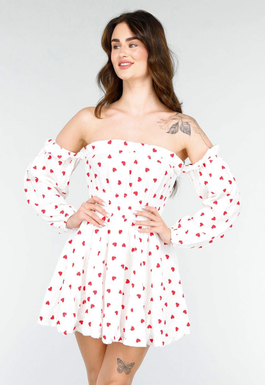Deze prachtige luchtige jurk met een vrolijke rode hartjesprint op een witte achtergrond is perfect voor een zonnige dag. Het off-shoulder ontwerp met lange, elastische mouwen creëert een vrouwelijke look. De taille is elastisch, waardoor de jurk mooi aansluit en comfortabel is om te dragen. Een perfecte keuze voor een feest of casual uitje!