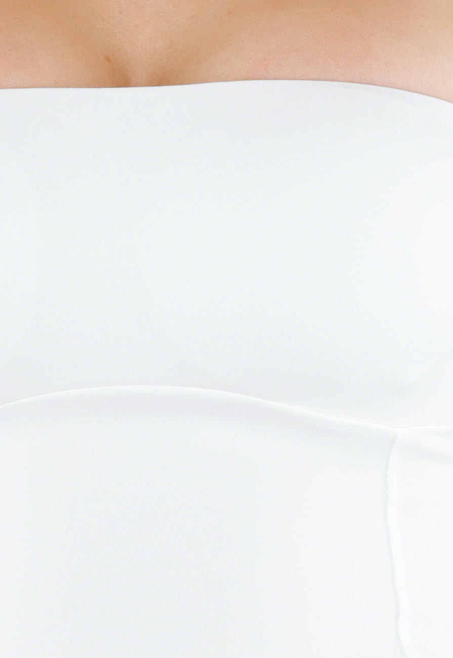 Deze witte strapless top heeft een rechte halslijn met ingewerkte pads en een aansluitende pasvorm. De top is gemaakt van een glad, licht elastisch materiaal dat comfortabel aansluit op het lichaam. De naden aan de voorkant geven subtiele structuur en vorm. De onderkant van de top is recht afgewerkt.