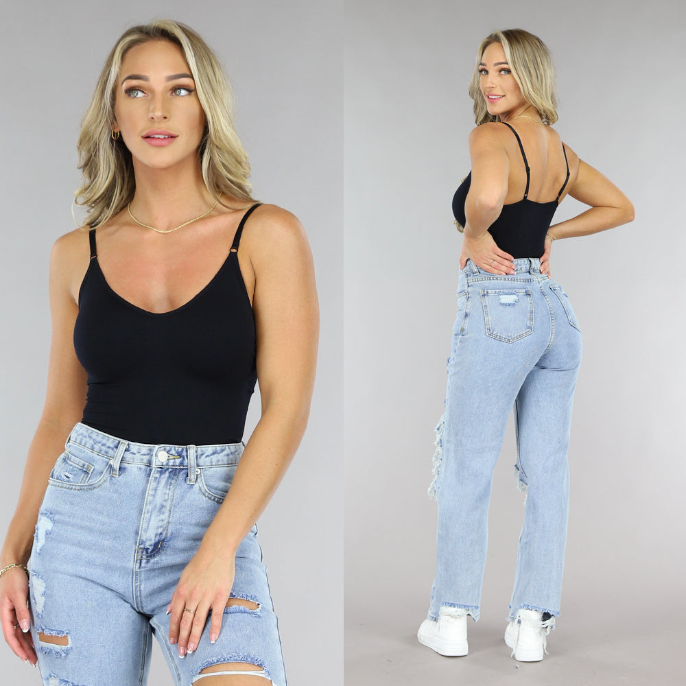 Deze zwarte bodysuit is elastisch en heeft een fijn gebreid ontwerp. De bodysuit heeft aan de achterzijde verstelbare spaghettibandjes en valt als een string, de body bevat geen cups. Aan de onderzijde van de bodysuit zit een haaksluiting bestaande uit drie haakjes welke je op drie standen kunt stellen.