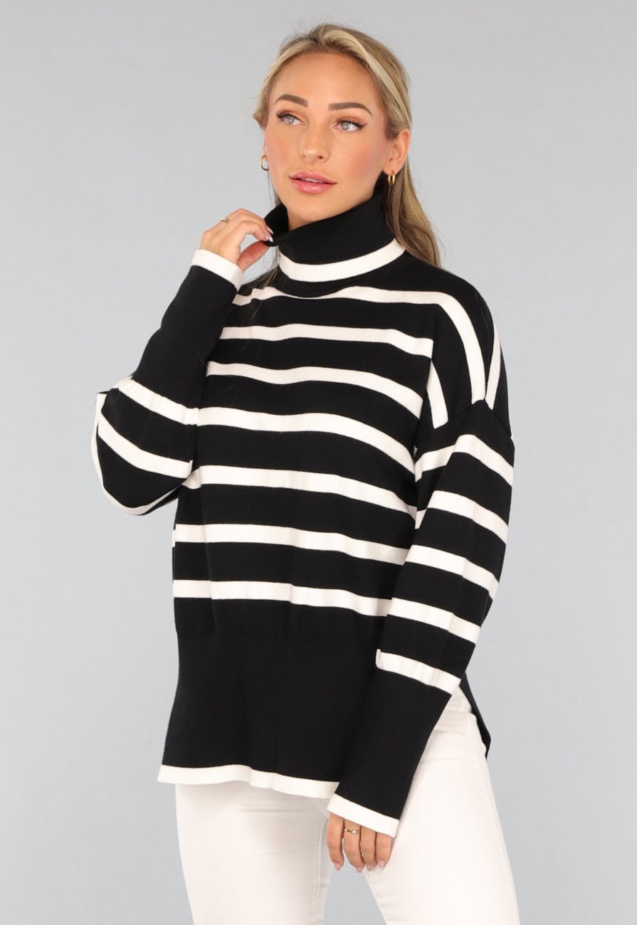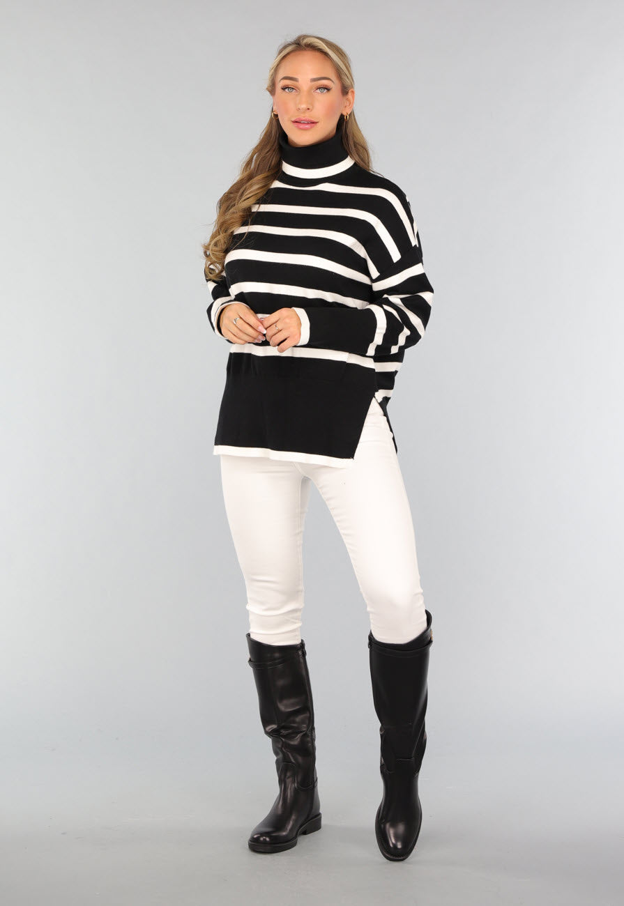 Deze coltrui is zwart met witte strepen en heeft aan de onderzijde een brede zwarte band. Hij is voorzien van lange mouwen en een grote col welke je om kan slaan. De trui valt een klein beetje oversized en heeft aan beide zijkanten een splitje.