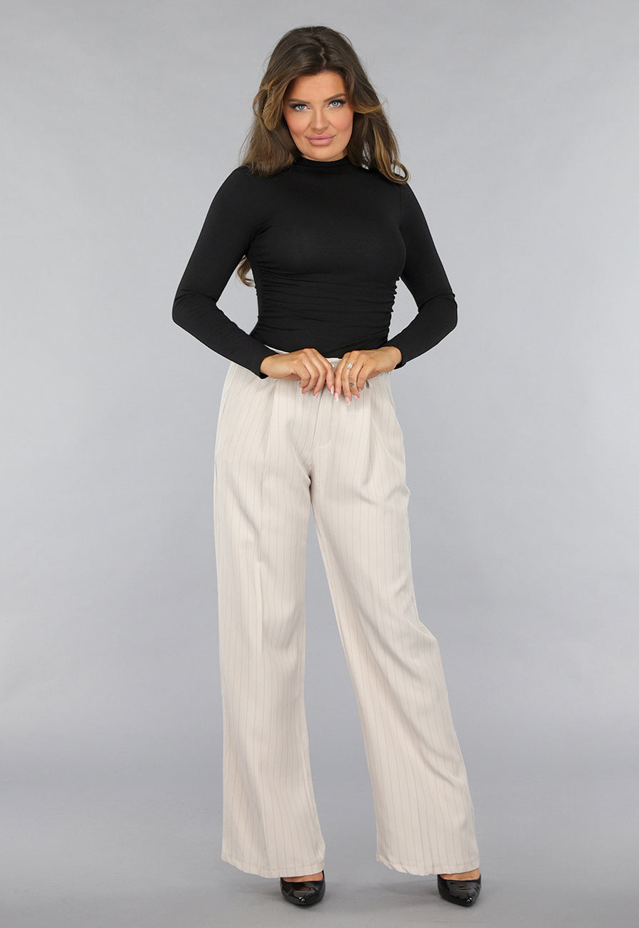 Deze top is gemaakt van een fijne rekbare stof. Het topje heeft lange mouwen en een hoge kraag. De top heeft in de taille geplooide details. De top is effen van kleur.