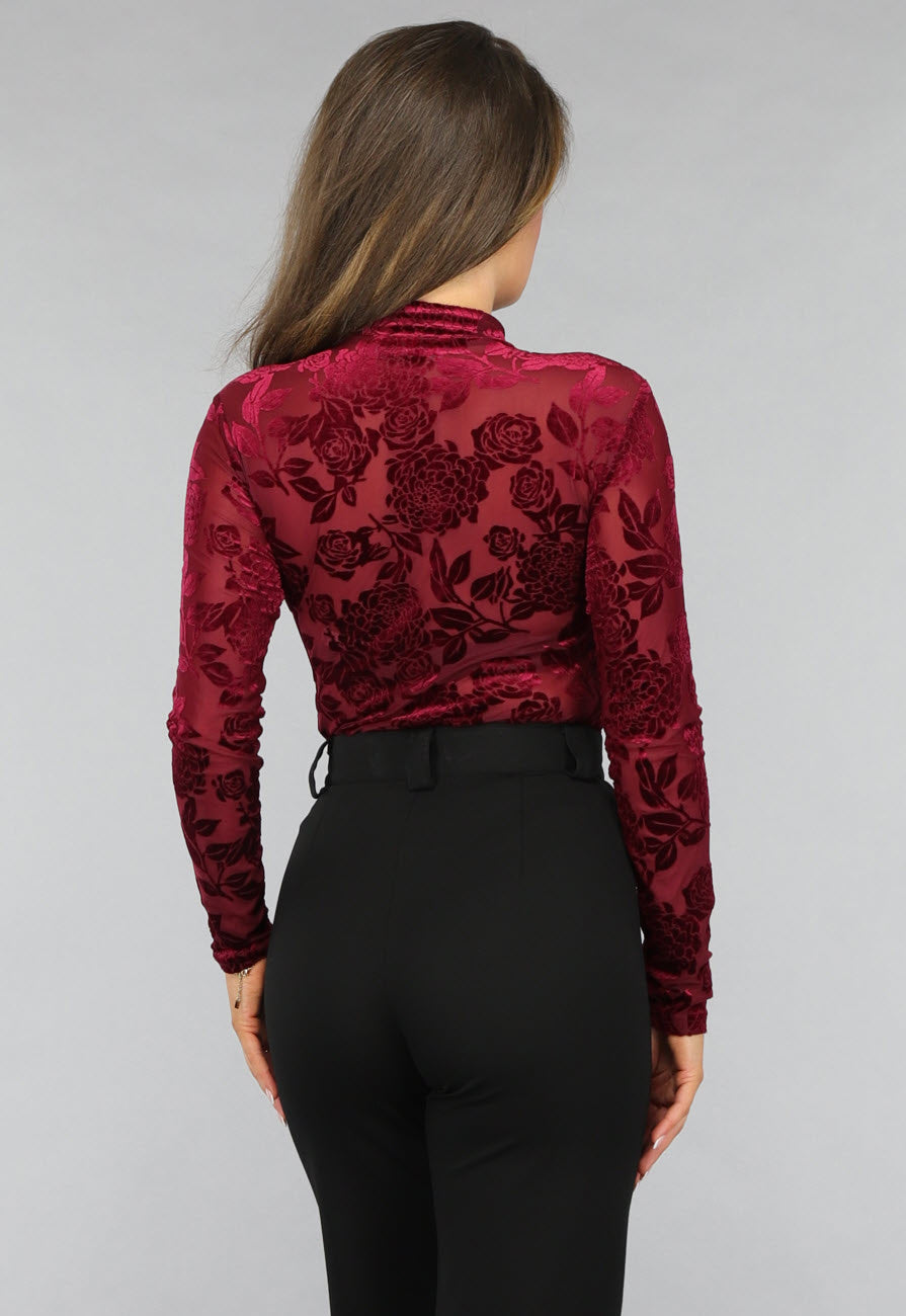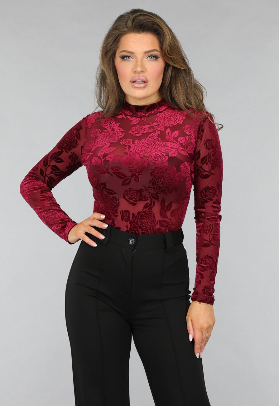 Bordeaux Rode Velvet Bloemen Bodysuit