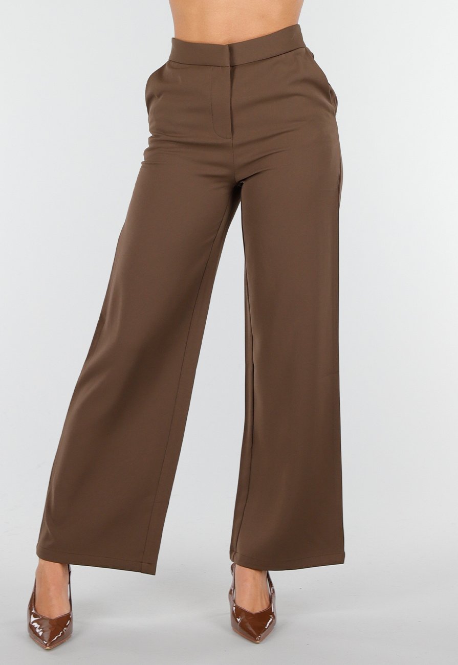 Deze bruine matchende set bestaat uit een mouwloze top en een bijpassende wide leg broek. In de taille zit een witte riem met een grote goudkleurige gesp in organische bloemvorm. Aan beide zijden bevinden zich kleine klepdetails. De broek heeft een hoge, gladde tailleband en rechte wijde pijpen.