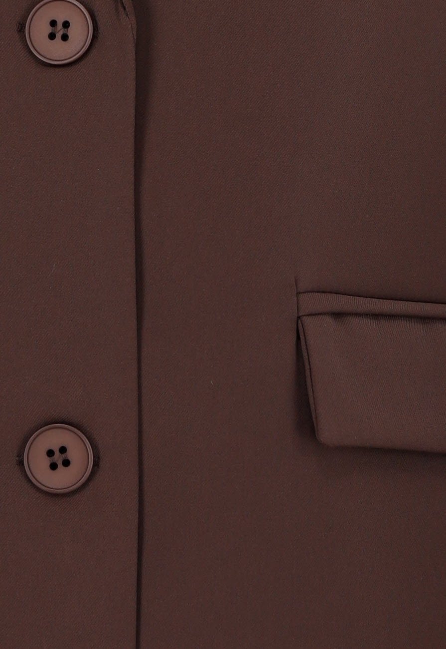 Deze bruine blazer heeft een oversized pasvorm en sluit met twee knopen aan de voorkant. Het model is voorzien van klepzakken, schoudervullingen en een borstzakje. De lange mouwen zijn afgewerkt met knoopdetails bij de manchetten. De achterkant heeft een enkele split voor extra bewegingsvrijheid. Dankzij de rechte snit is de blazer veelzijdig te combineren.
