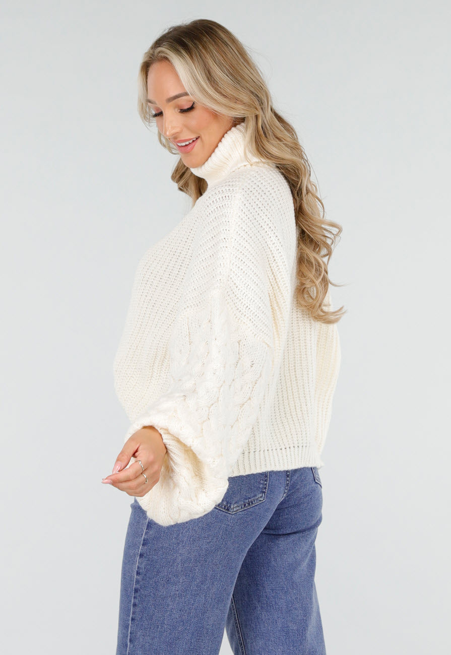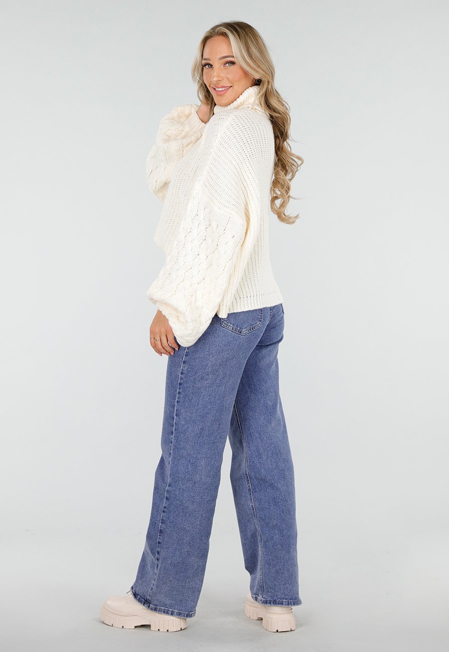 Deze crèmekleurige coltrui is vervaardigd uit grofgebreid materiaal en heeft een hoge omgeslagen col. De ballonmouwen zijn voorzien van een duidelijk zichtbaar kabelpatroon dat contrasteert met het ribbreisel van de body. De trui heeft een losse, rechte pasvorm en valt tot op de heup.