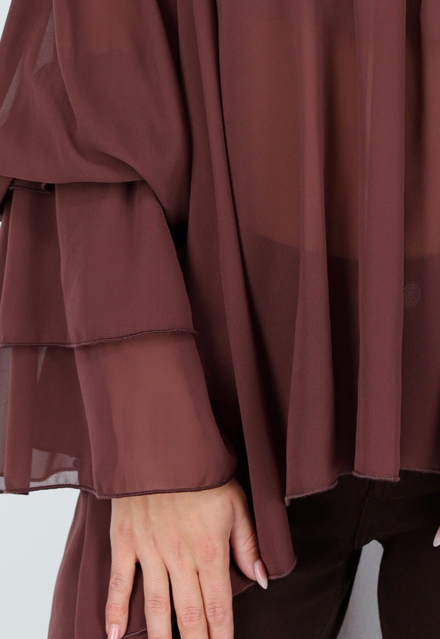 Deze blouse is uitgevoerd in een donkerbruine, doorschijnende stof met een losse pasvorm. Het model heeft een elastische halslijn die over de schouders valt en zorgt voor een off shoulder look. De lange mouwen lopen wijd uit en zijn voorzien van gelaagde volants voor extra volume. De achterkant van de blouse is langer dan de voorkant, wat zorgt voor een asymmetrisch effect.