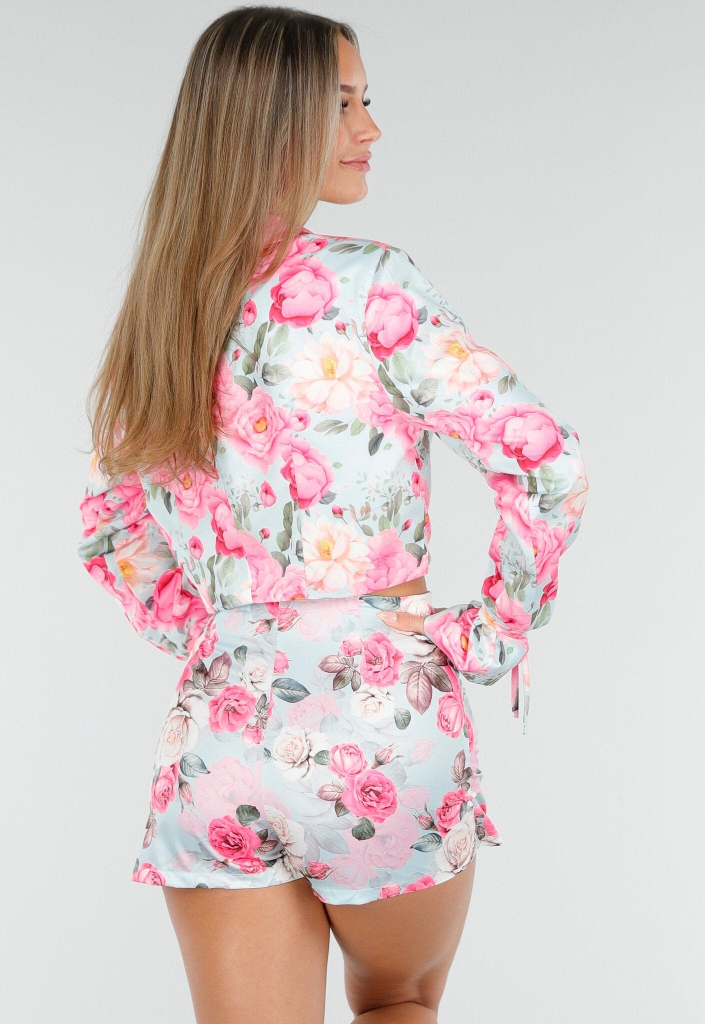 Deze two piece set bestaat uit een cropped blazer en een bijpassende rok, beide uitgevoerd in een kleurrijke bloemenprint met roze en blauwe tinten. Het jasje heeft een dubbele rij zwarte knopen, een puntige reverskraag en lange mouwen met geplooide manchetten die gestrikt worden met touwtjes. Daarnaast is de blazer voorzien van schoudervullingen. De rok sluit mooi aan en is kort van lengte, wat zorgt voor een elegante uitstraling.