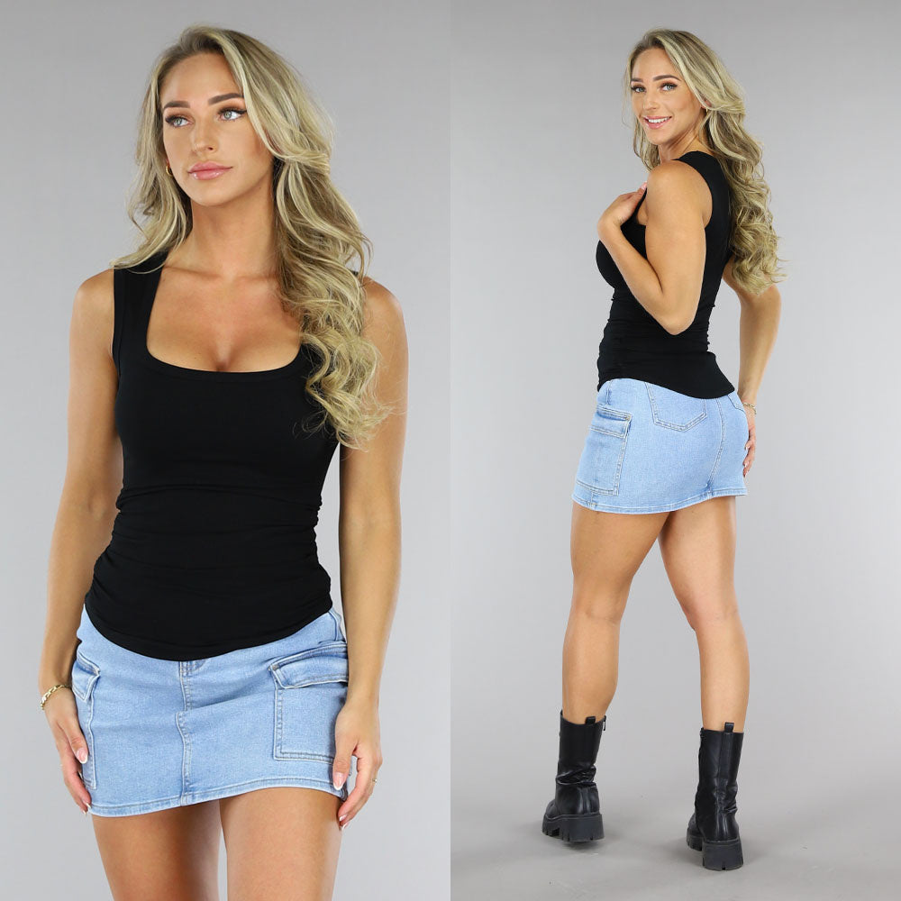 Deze tanktop is gemaakt van een elastische ribstof. Het topje heeft brede schouderbanden. Het topje bevat stretch en aan de zijkant heeft hij een geplooid detail. Het topje is effen van kleur, dus makkelijk te combineren.