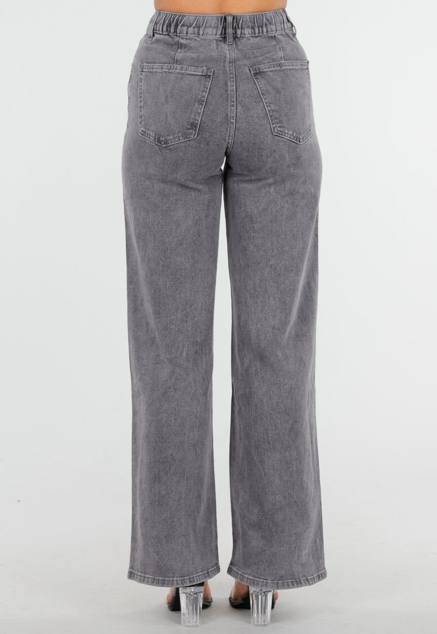 Deze grijze jeans is uitgevoerd in een wide leg model met een hoge taille en elastische band. De voorkant is voorzien van verticale naden en een striksluiting in dezelfde denimstof. De broek heeft twee voorzakken en twee opgestikte achterzakken. De denim heeft een lichtgewassen afwerking met stretch. Het model loopt recht uit vanaf de heup en is lang van lengte.