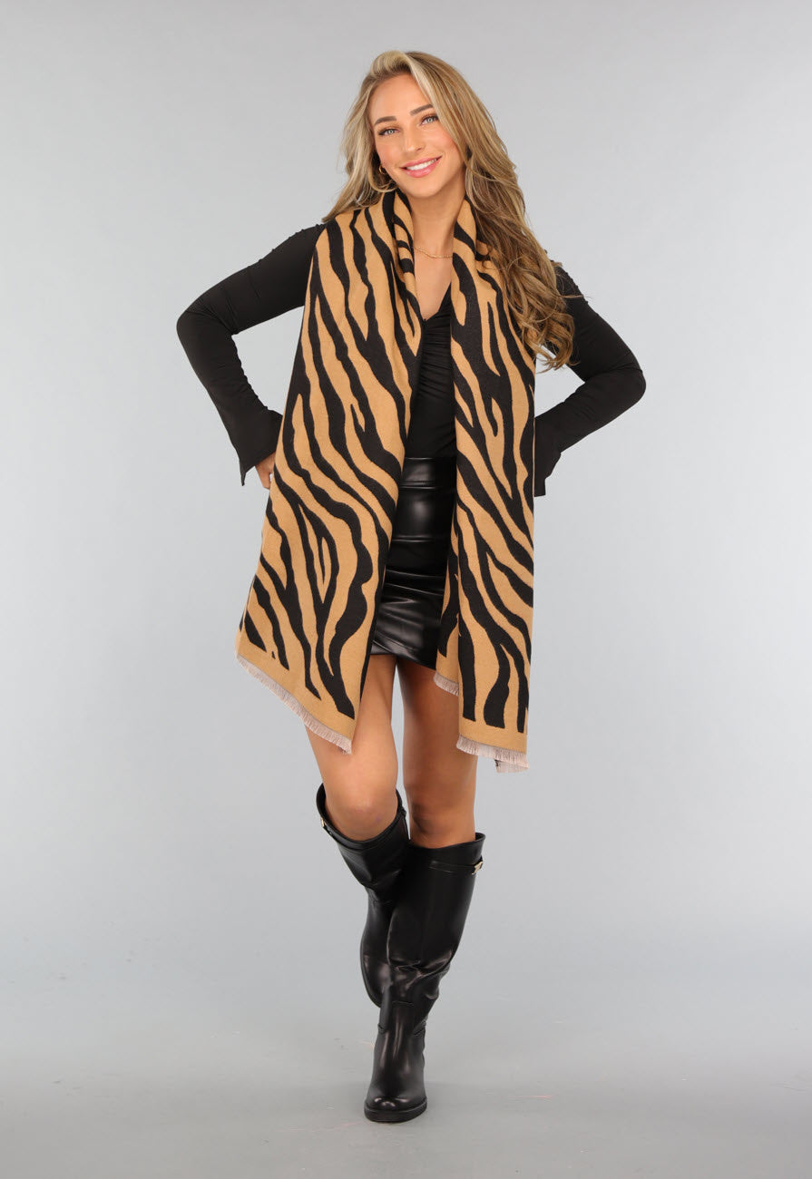 Deze sjaal is gemaakt van een zachte dikke stof. Deze sjaal is aan twee kanten te dragen waardoor deze sjaal eindeloos gecombineerd kan worden en hij is voorzien een zebraprint. Je kunt de sjaal omslaan en is heerlijk voor de koude dagen.