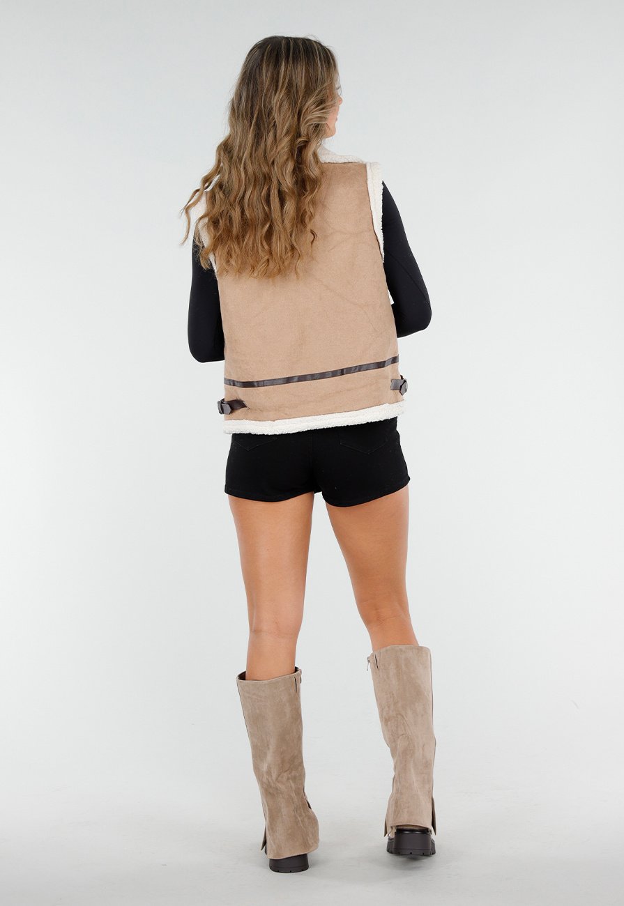 Deze hoge laarzen zijn uitgevoerd in een Khaki suèdelook materiaal met een iets geruwde textuur. Het model valt tot onder de knie en is voorzien van een grove zwarte zool met diep profiel. Aan de binnenzijde zit een rits over de volledige lengte voor het gemakkelijk aan- en uittrekken. De laars heeft een brede schacht en een stevige, licht verhoogde hak.