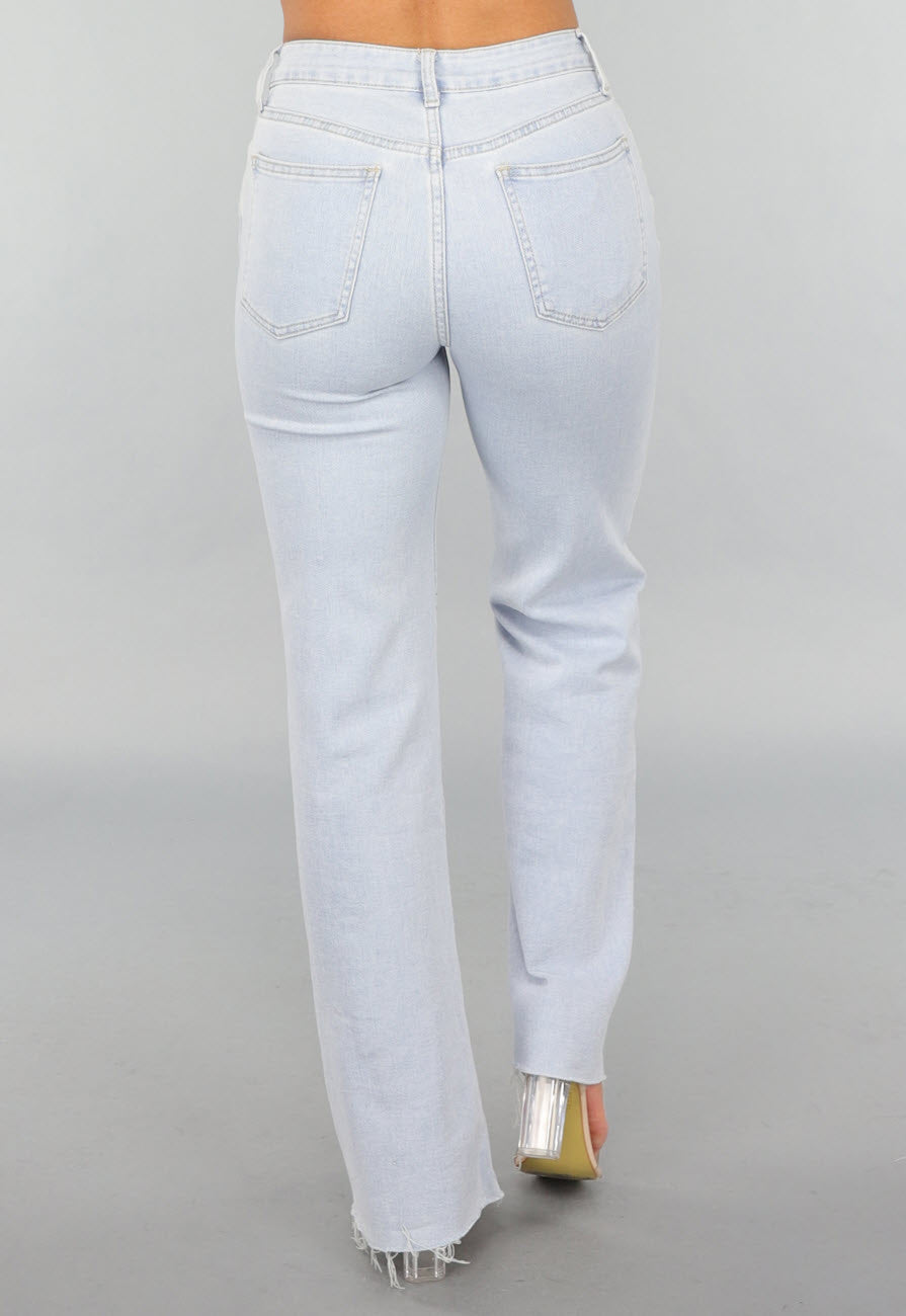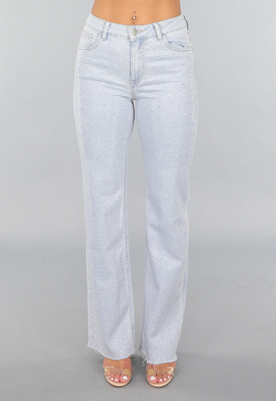 Lichtblauwe Wide Leg Mid Waist Strass Jeans