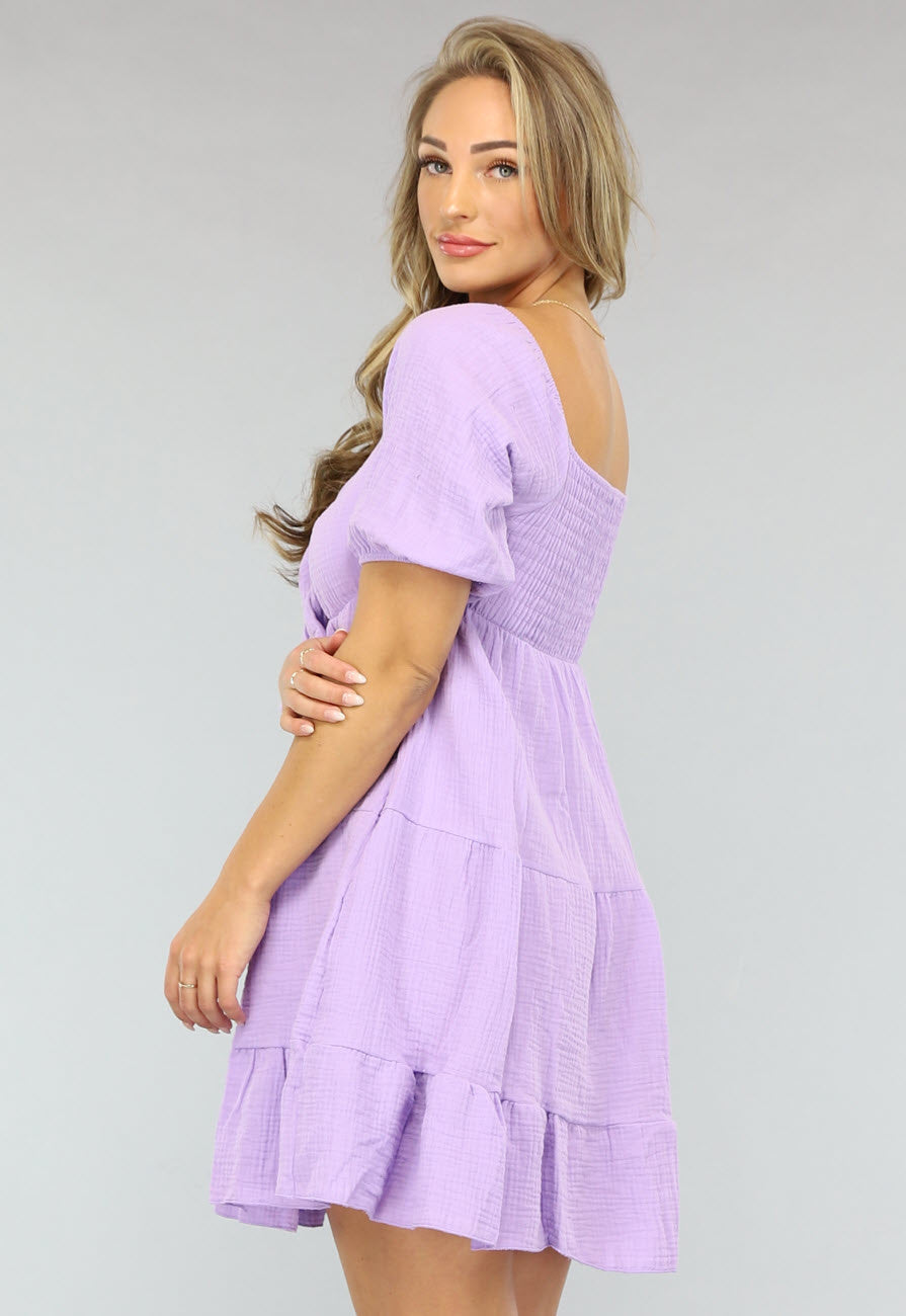Deze jurk is gemaakt van een zachte mousseline stof en heeft een wijd uitlopend layered model. De hals van de jurk is een V hals en loopt in een strik detail. Daarnaast is dit jurkje voorzien van een cutout onder de borst. Tevens heeft dit schattige jurkje korte pofmouwtjes, waardoor hij perfect is voor de zomer. De jurk kan gemakkelijk over het hoofd aangetrokken worden, doordat de achterkant voorzien is van een elastieken scrunch band.