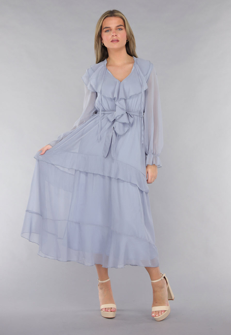 Deze lange jurk is gemaakt van een luchtige chiffon stof. De bovenkant van de jurk heeft een V-hals welke is afgewerkt met leuke ruches en een strikdetail. De jurk is voorzien van een wijd uitlopende rok met een gelaagd model. De jurk heeft trompetmouwen en zijn see-through. Hij is voorzien van een binnenjurk waardoor hij niet doorschijnt. De binnenjurk en de chiffonjurk bevatten geen stretch, maar vallen flowy. Rondom de taille is hij wel voorzien van stretch en tevens ook van een bijpassende tailleband.