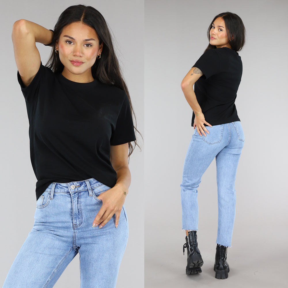 Dit zwart basic T-shirt is een essentieel kledingstuk voor elke garderobe. Het shirt is gemaakt van hoogwaardig katoen en heeft een lichte stretch voor extra comfort en flexibiliteit. De stof is ademend en voelt zacht aan op de huid. Het T-shirt heeft een klassieke pasvorm en een ronde halslijn, waardoor het gemakkelijk te combineren is met allerlei verschillende kledingstukken. Het shirt is duurzaam en kan vele malen worden gewassen zonder dat de kleur of pasvorm verloren gaat. Dit product is ideaal voor iedereen die op zoek is naar een comfortabel en veelzijdig T-shirt voor dagelijks gebruik.
